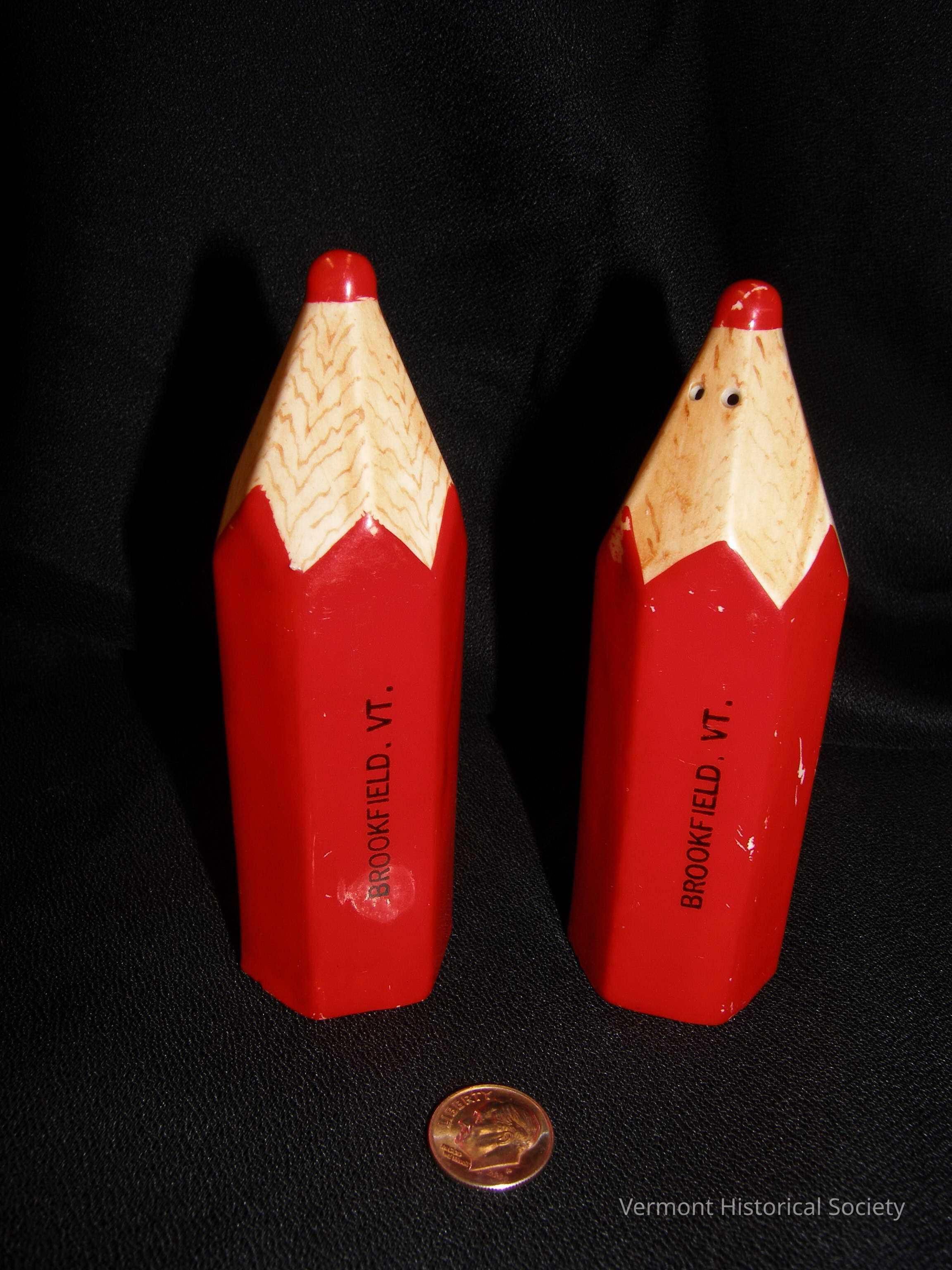 Ceramic salt and pepper shakers shaped like pencils. Each shaker has six sides and tapers into a rounded point at the top. The body and the point are painted red and the tapered portion is grained to look like wood. One side of each is printed with the inscription, "BROOKFIELD, VT." There is a round hole in the bottom of each shaker that is stoppered with a cork.