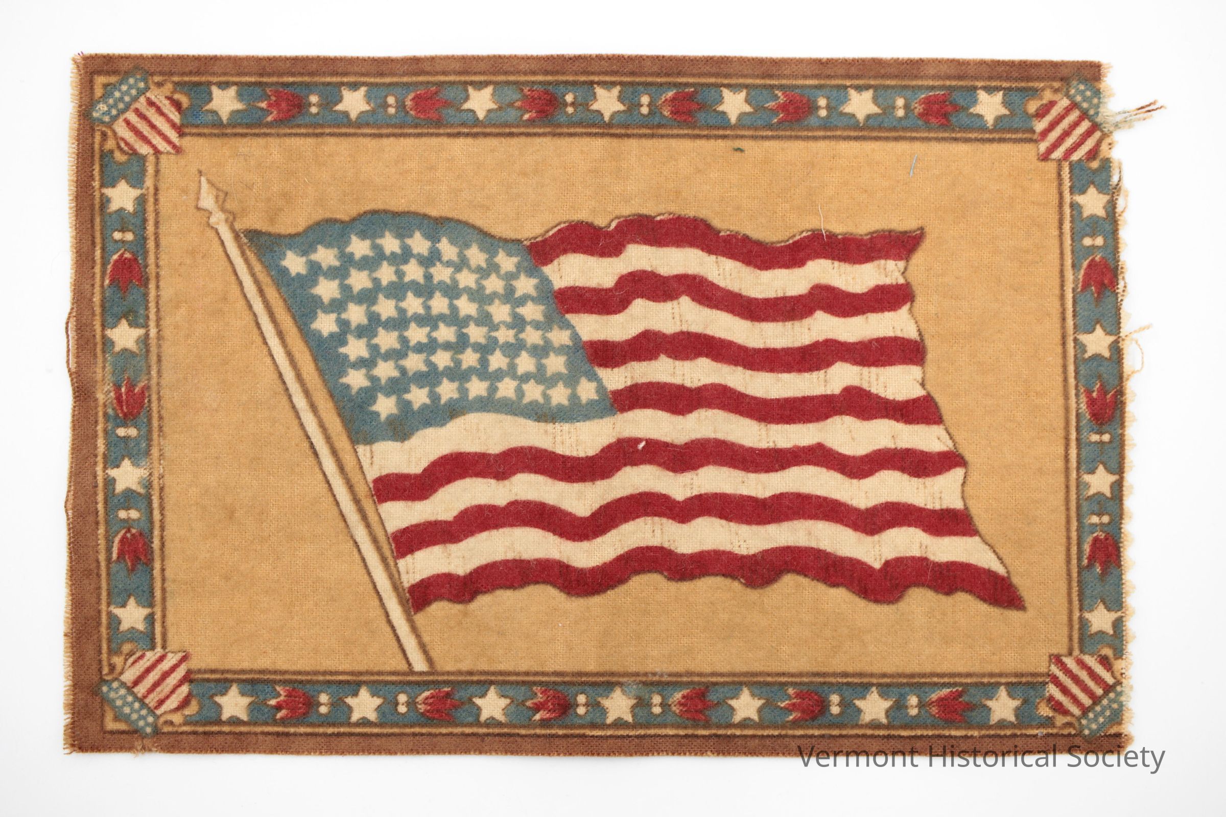 Miniature rug sized for a dollhouse made from a cigar box insert. The rug is made of cotton flannel and printed with a border of red tulips and white stars with American shields in the corners. The center is printed with a waving American flag with 48 stars.Context