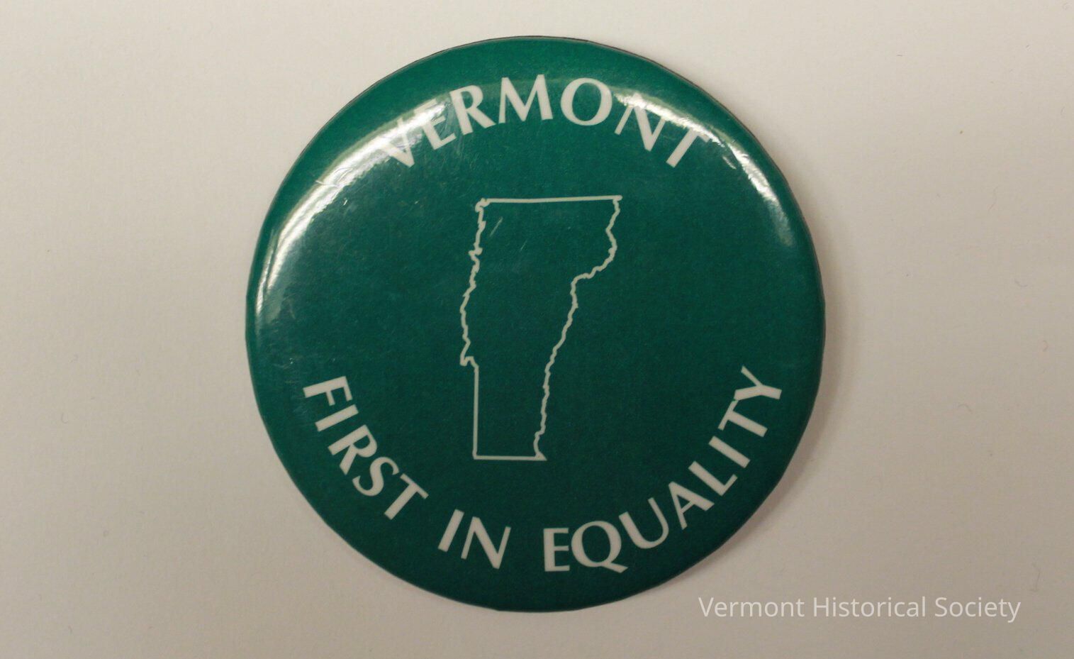 Dark green pin with white writing- "VERMONT- FIRST IN EQUALITY"