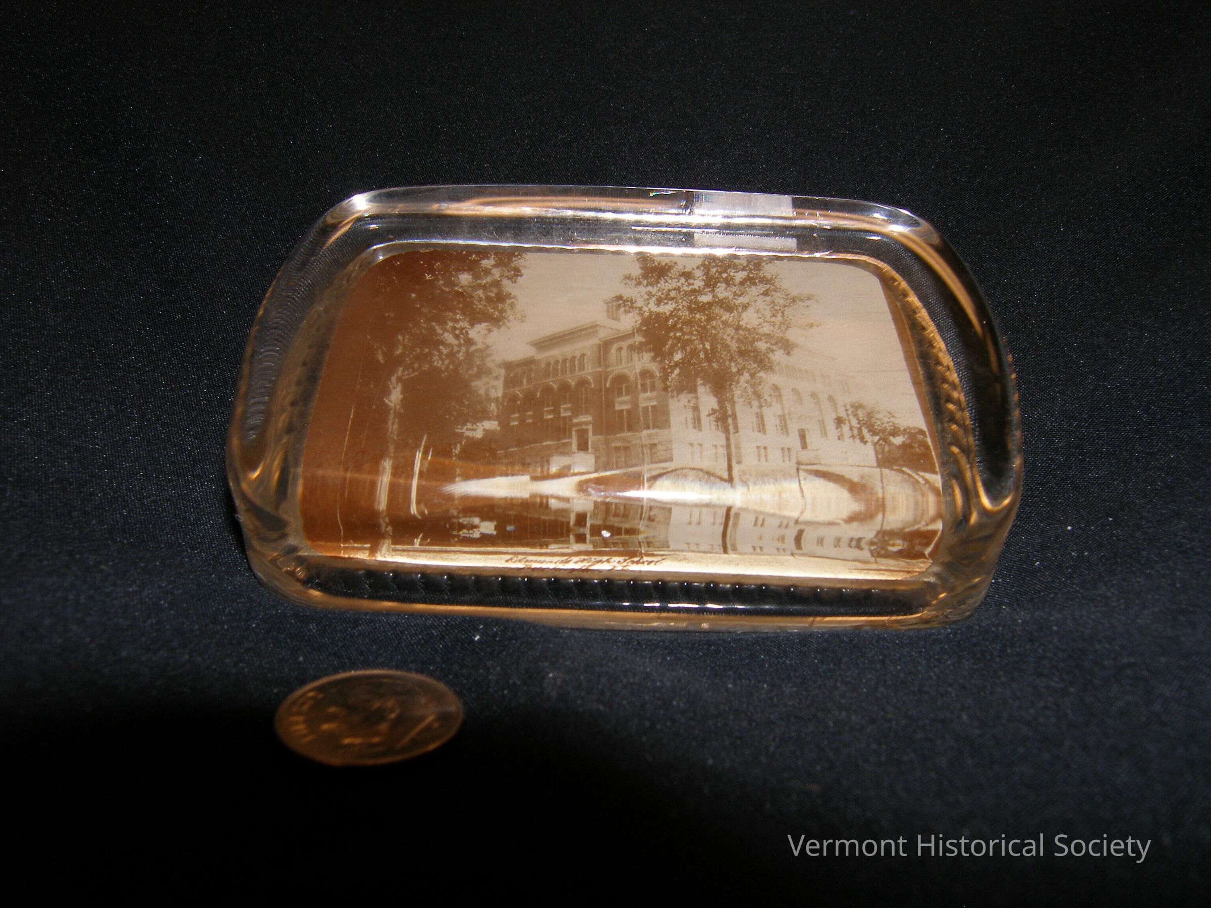 Thick, rectangular glass paper with a sepia-toned photograph of a large building pasted to the bottom. The photograph is labeled, "Edmunds High School, Burlington, Vt." at the bottom center. The very bottom is lined with faux red Moroccan leather.Acquisition