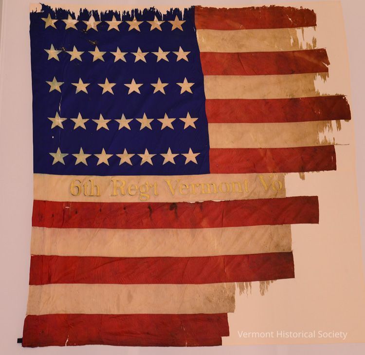 6th Vermont Infantry Regiment national flag. Attached to staff by a sleeve. There are 34 white stars arranged 7-7-6-7-7. Regimental Designation says "6th Regt Vermont Vols" on the 8th stripe.