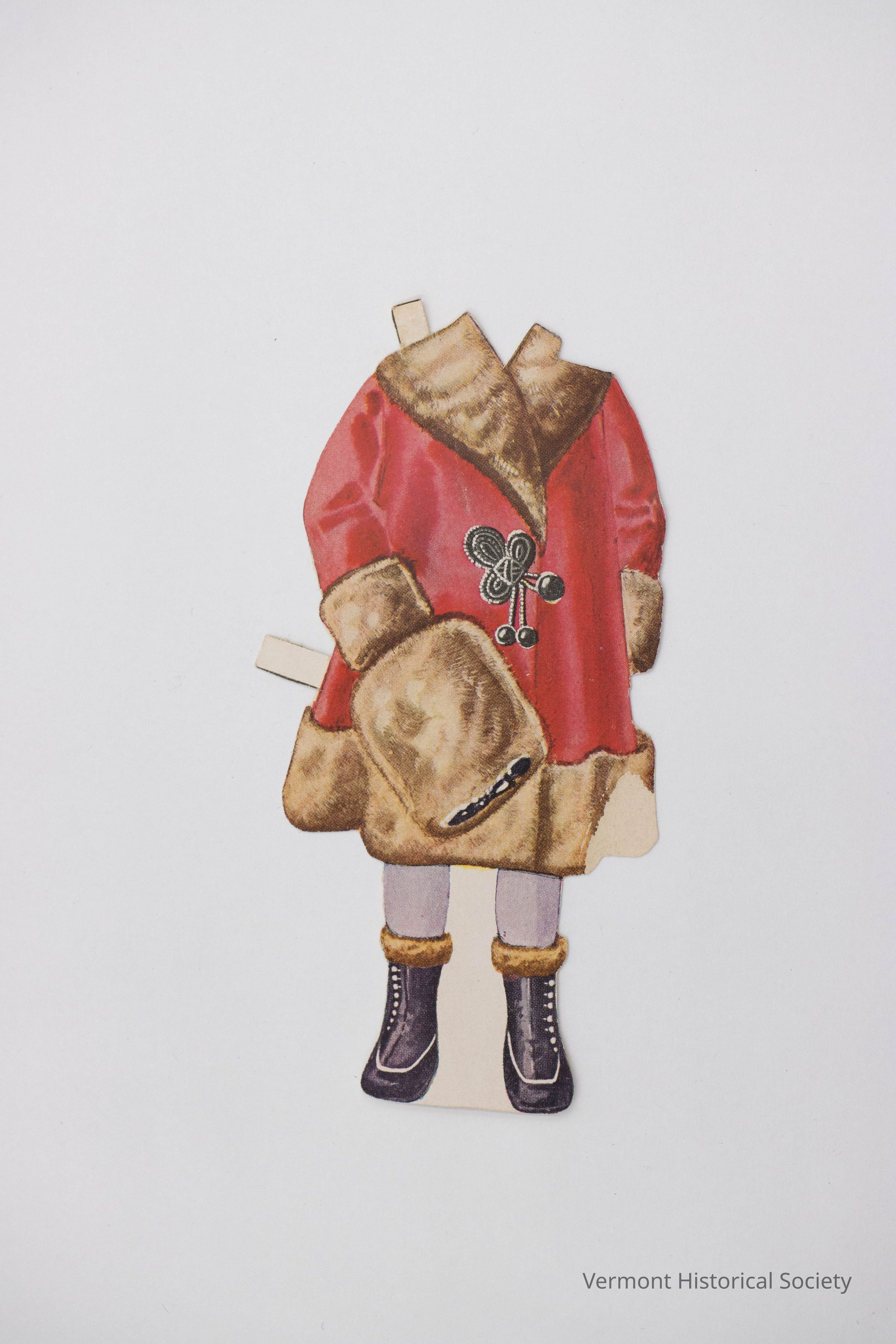 Printed paper coat dress for a paper doll. The red coat is trimmed with brown fur and has a large black frog clasp at the center front. The back is labeled in ink, "Winter Girl."Context