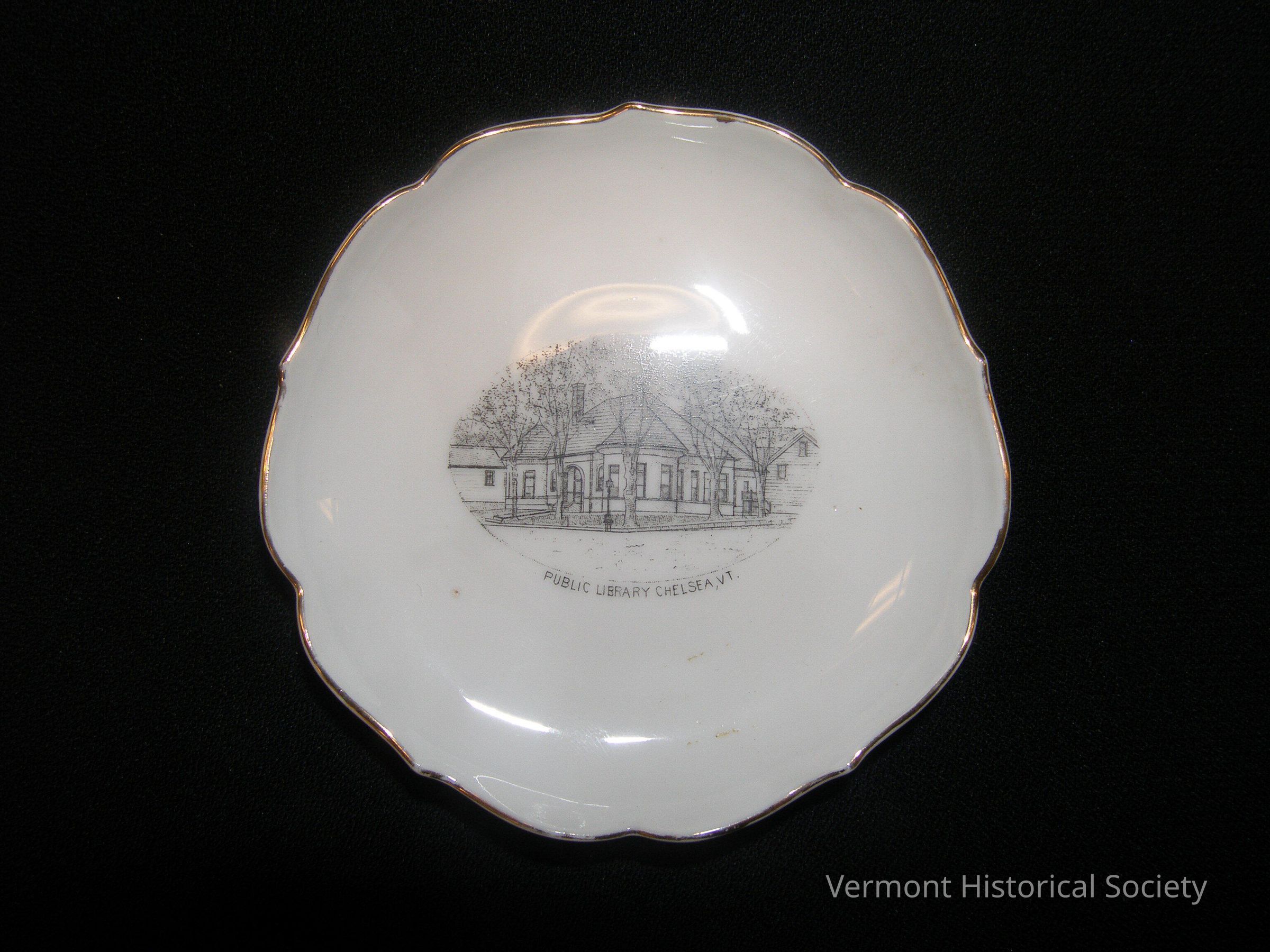 White porcelain cup plate printed at the center with a line drawing of a building with round rooms at the corners. The image is labeled, "PUBLIC LIBRARY CHELSEA, VT." The reverse is marked, "B.F.H.S. China Made in Austria for W. S. Hatch, Chelsea, Vt."