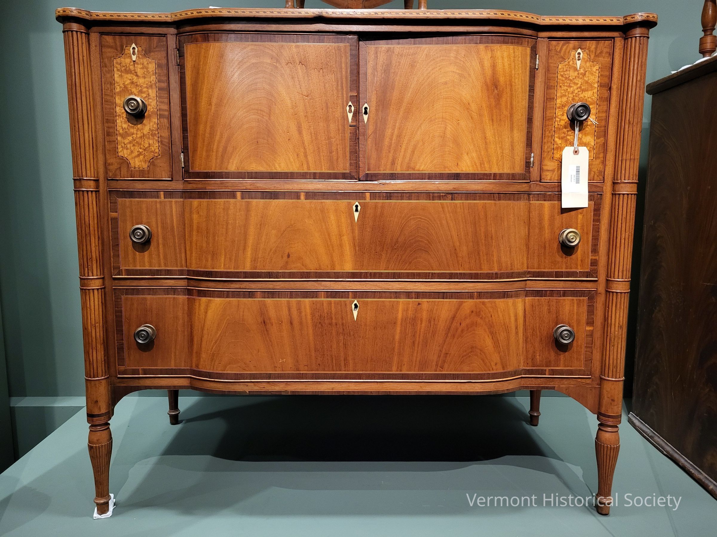 Cabinetmakers Sampson Warner, George Stedman, and Royal Gould all worked in Chester. It's thought that Stedman and perhaps Gould apprenticed to Warner. Stedman and Gould family members ran a mercantile business in Chester in close proximity to a similar business owned by the Onion family. The string inlay along the top and the complex shape of the front certainly relate to furniture made by both Gould and Stedman. Stedman ultimately moved to Norwich and Gould to Rutland. The Onion family, including Alfred, also moved to the Rutland area and may indicate a connection between the Goulds and the Onions.