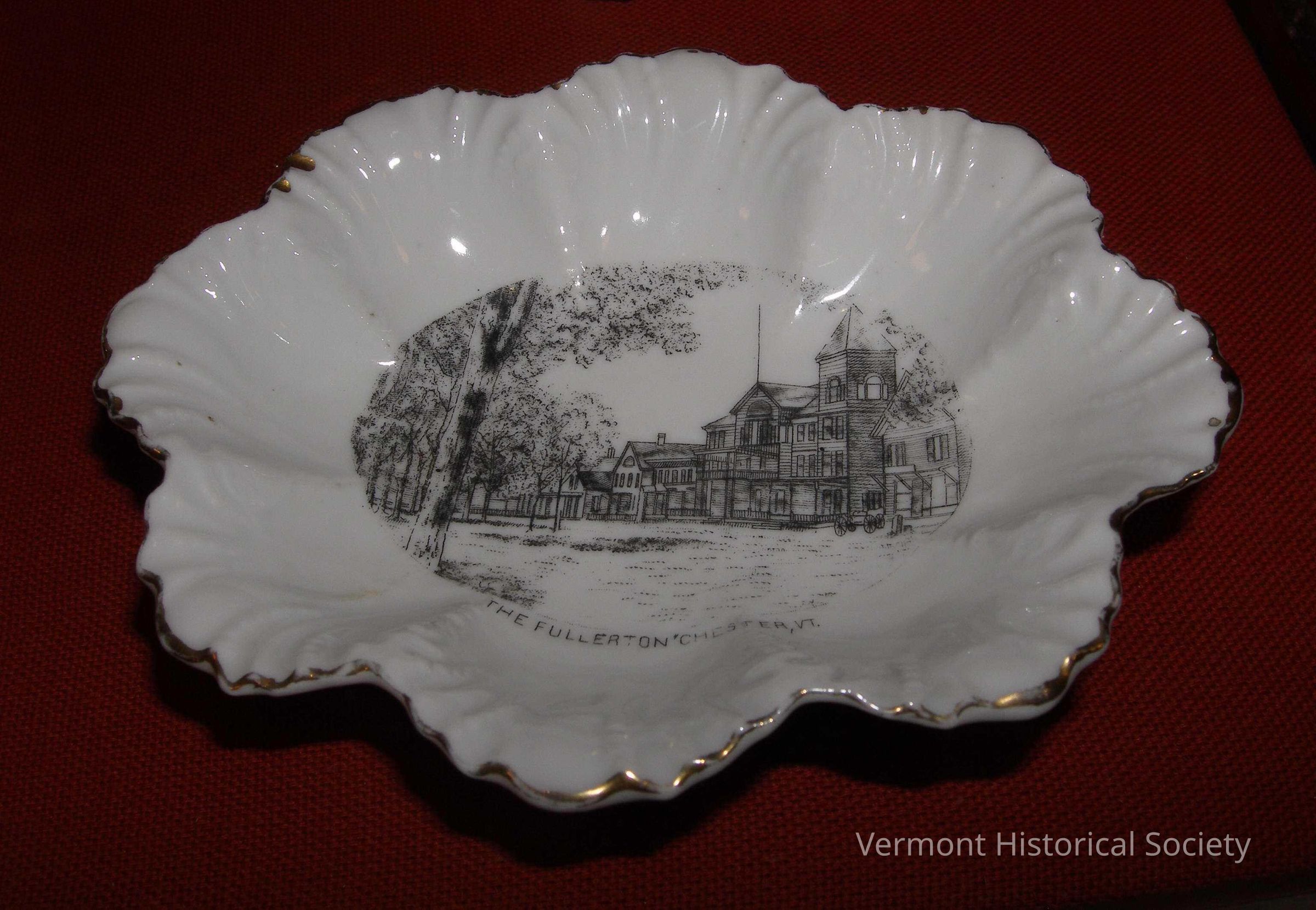 Flower-shaped saucer with raised and fluted rim. The center of the saucer is printed with an illustration of a street lined on one side with trees and on the other side with large buildings. The image is labeled, "The Fullerton, Chester, Vt." The reverse is marked, "B.F.H.S. China, Made in Austria for Adams & Davis, Chester, Vt."Context