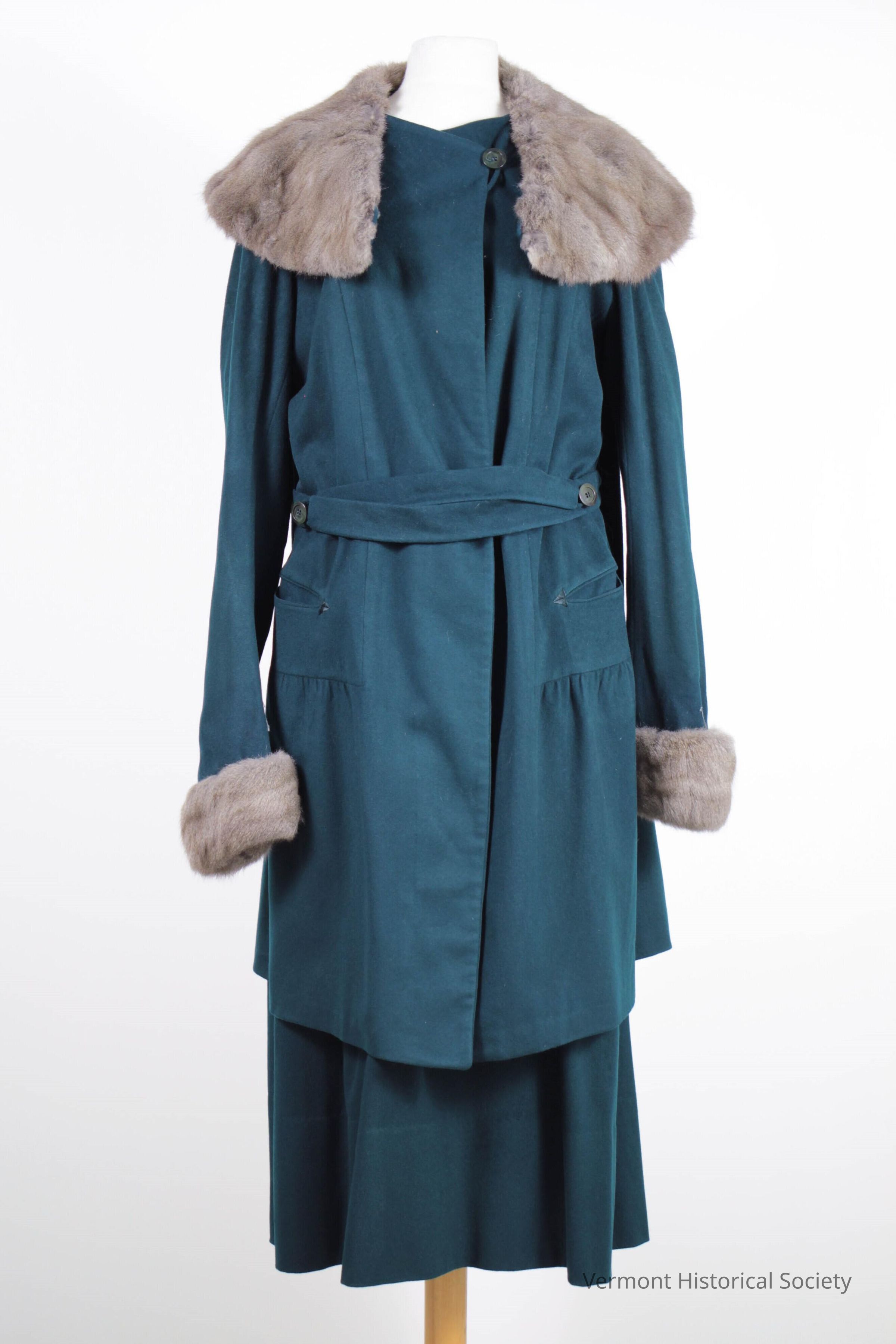 Blue-green wool suit consisting of a coat and skirt. The coat has long sleeves, and the cuffs and collar are fur. There are two welt pockets at the waist. It secures at the center front with a single button at the left shoulder. There are two additional buttons on either shoulder beneath the collar, which is attached only at the back neckline. The side hips are accented underneath the pockets by small areas of gathers. There is a permanently attached belt that secures across the front with two buttons. The back has a loose panel that ends at the waist with two long, triangular tails on either side, terminating in long silk tassels. The skirt is made from the same wool and sits at the natural waist. There is a permanently attached belt that secures in the front with a single button.Context