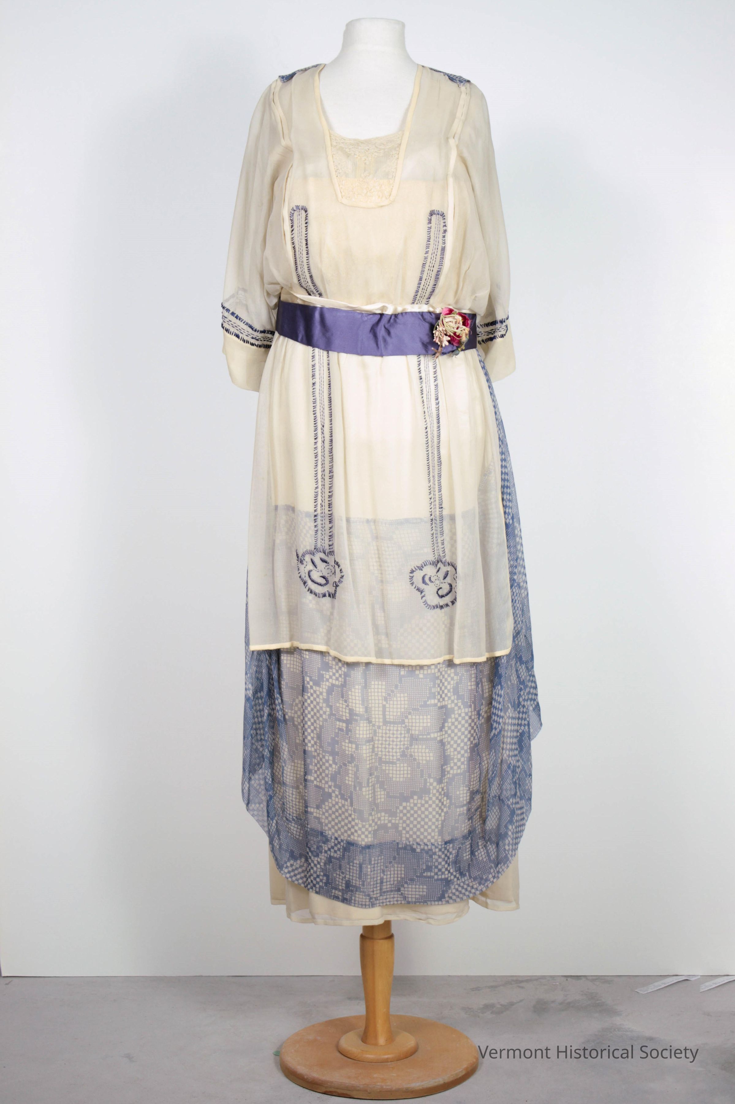 Cream-colored silk chiffon dress with purple embroidery and lace. The bodice has a square neckline and elbow-length sleeves. There are purple shoulder straps, and the waistline, accented with a purple satin ribbon and silk flowers, sits near the wearer's natural waist. The skirt is constructed in layers: an opaque silk lining, purple floral lace, and short cream organza panels that fall to about the knee. The top layer of the skirt is embroidered with rayon thread with two clouds and straight stitched rectangles that stretch from the clouds to the bust. The sleeve cuffs are embroidered with a border in the same pattern as the rectangles.Context