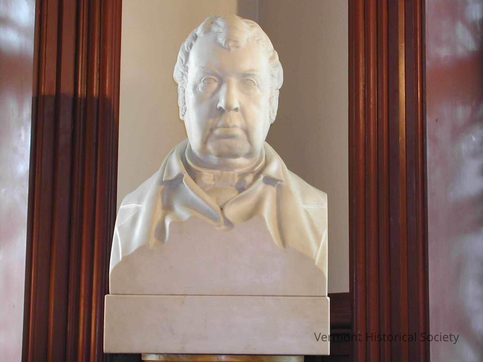 Marble bust of a man. He is shown with short, curly hair and long sideburns. He has noticeable jowls, and is wearing a suit coat and high-collard shirt. The front breast of the bust is sheared flat.Artwork Details