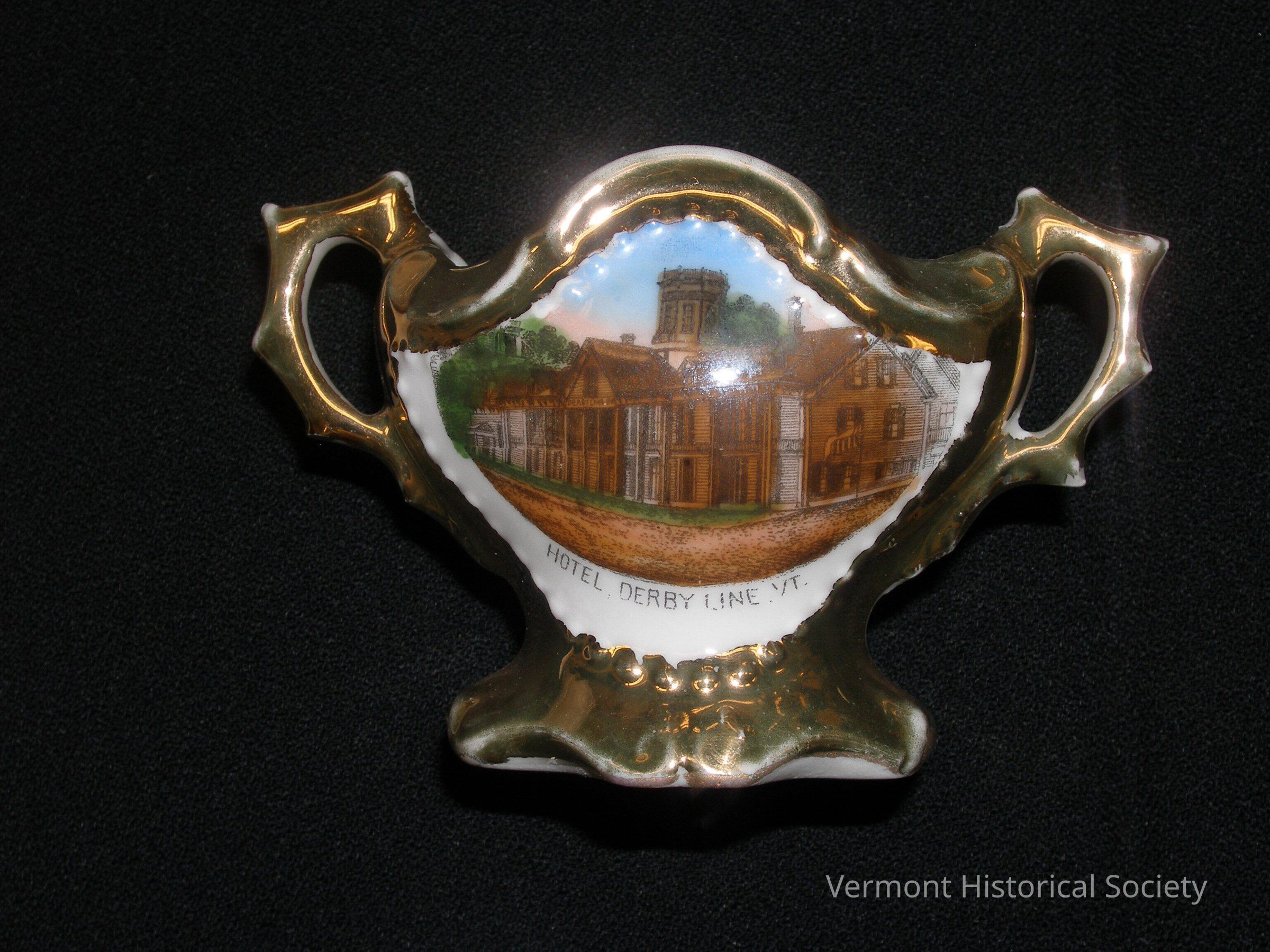 Miniature vase in the shape of a loving cup. The front has an illustration of a long neoclassical building with a round, central cupola and a four-columned portico. The illustration is partially colored with the building painted brick red and has the label, "HOTEL, DERBY LINE, VT." The rest of the vase is lustered in gold. The bottom bears the mark, "Made in Germany for "R. C. Parsons, Derby Line, Vt."
