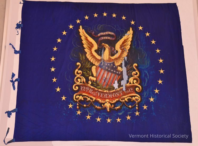 12th Vermont Infantry regimental flag. Blue background. Eagle surround by gold stars.