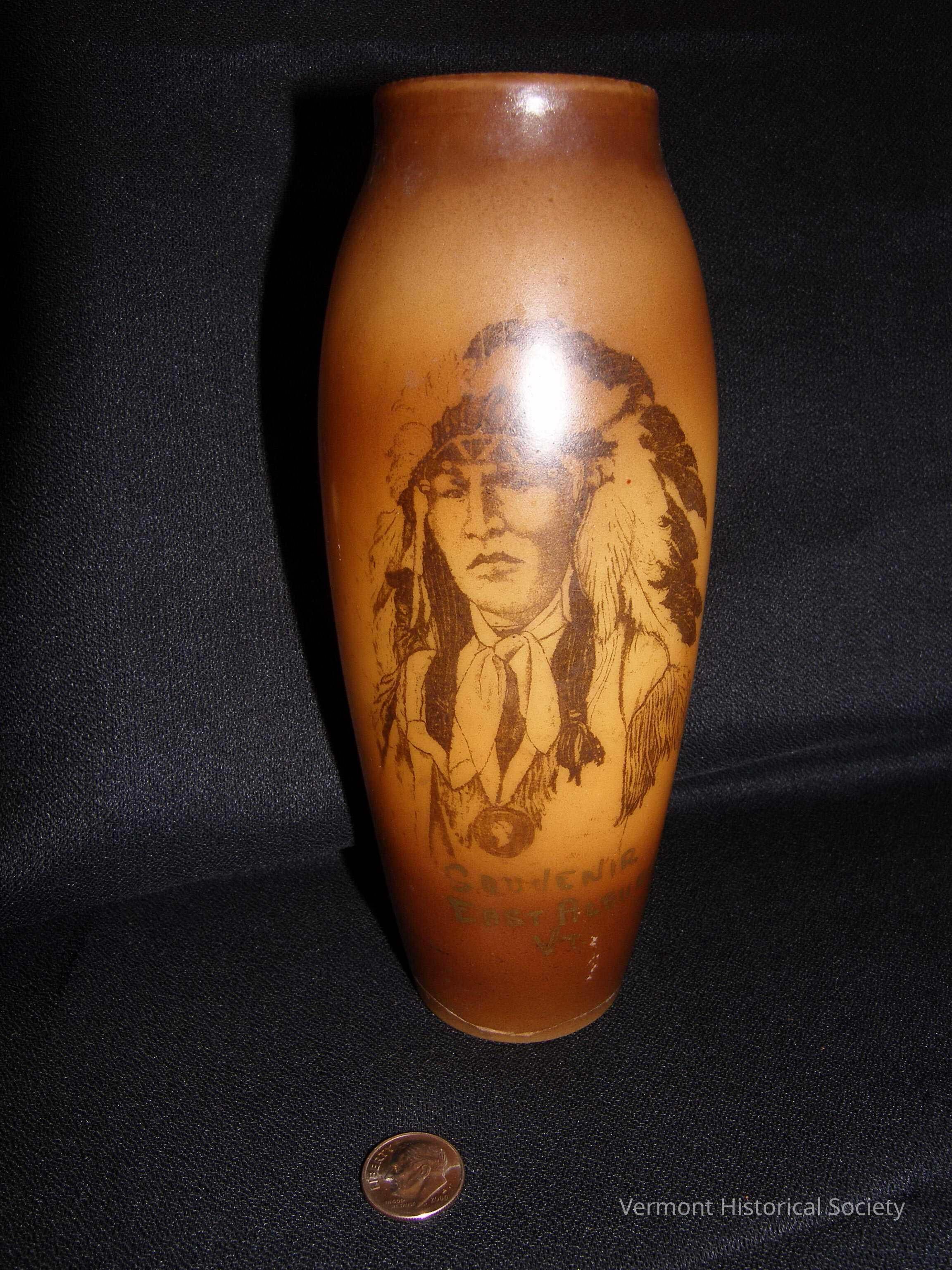 Milk glass vase painted in variegated shades of brown. An image of an indigenous American man wearing a large, feathered war bonnet, neck scarf, and peace medal is printed in dark brown at the center. Beneath the image is the hand-painted inscription, "Souvenir, East Alburg, Vt." in gold.Acquisition