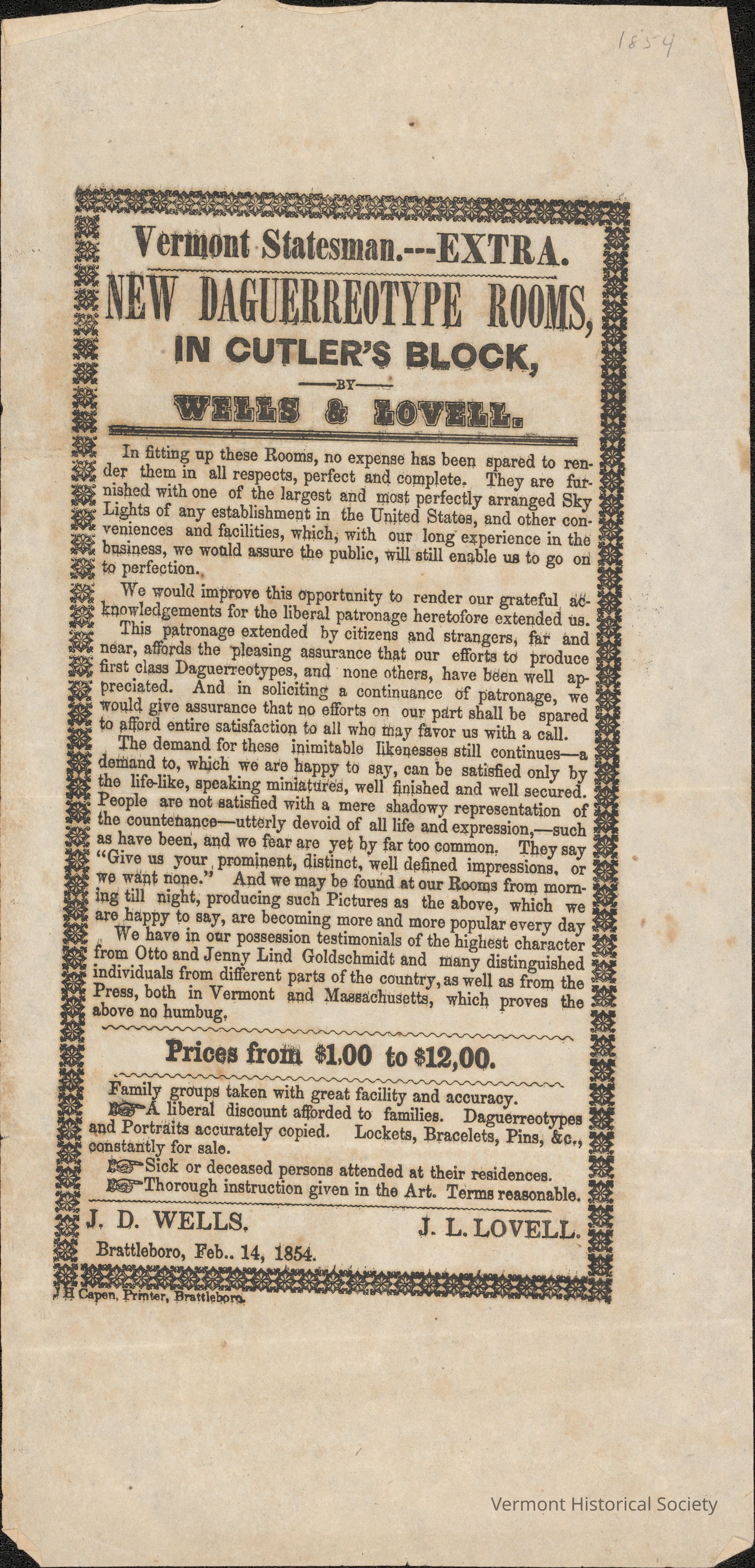 Advertising card for New Daguerreotype Rooms in Cutler's Block in Brattleboro