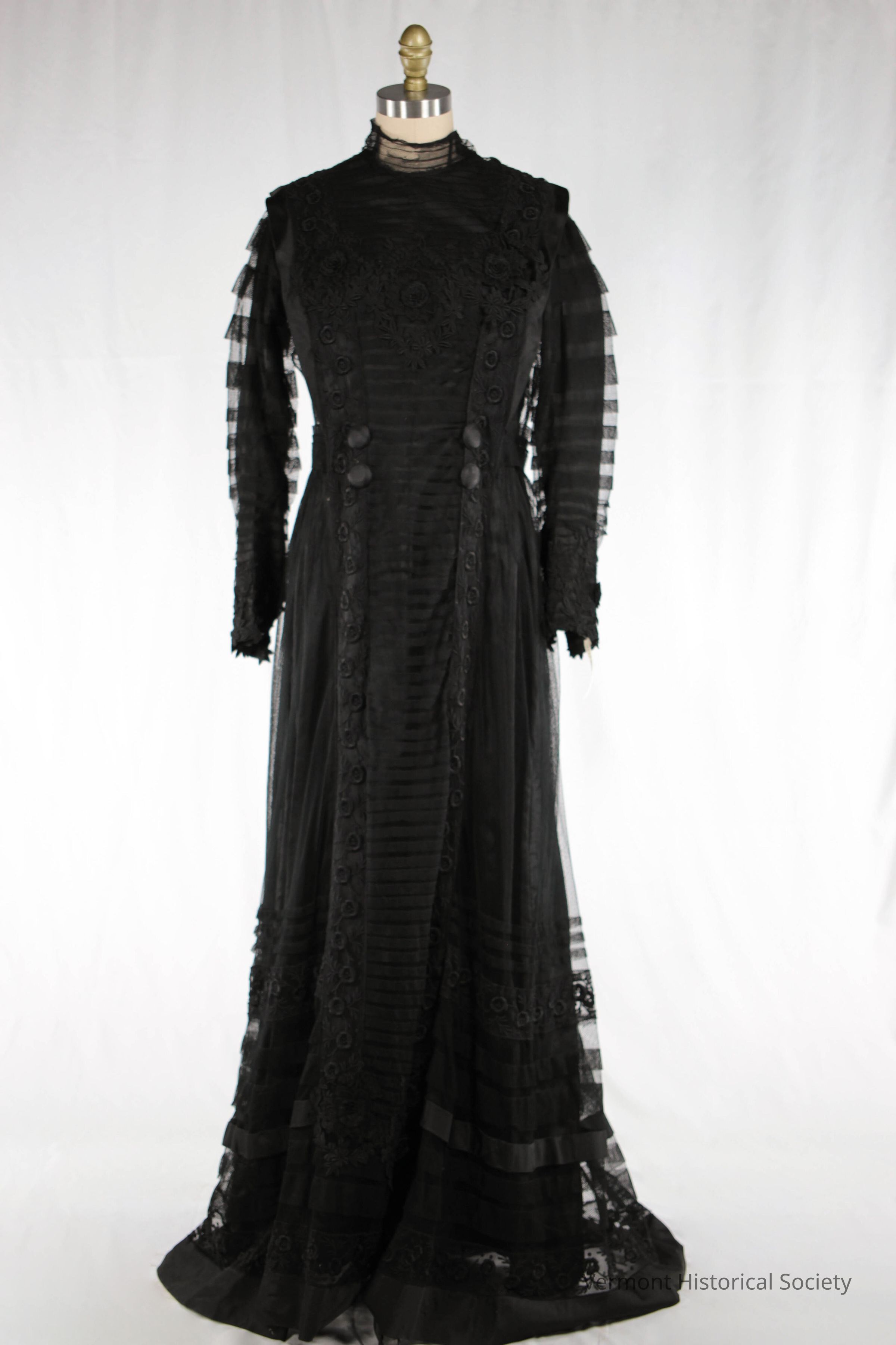 A long and elaborate black net dress. There are two ribbons of embroidery that go down the length of the dress. It is cut in a princess line and is cut for a bustle in the back. It has a high net collar that unhooks at side and also has hooks down the down side of dress. There are tiny tucks down the long sleeves,which have heavily embroidered cuffs. The center panel of the skirt has the same style of tucks.Context
