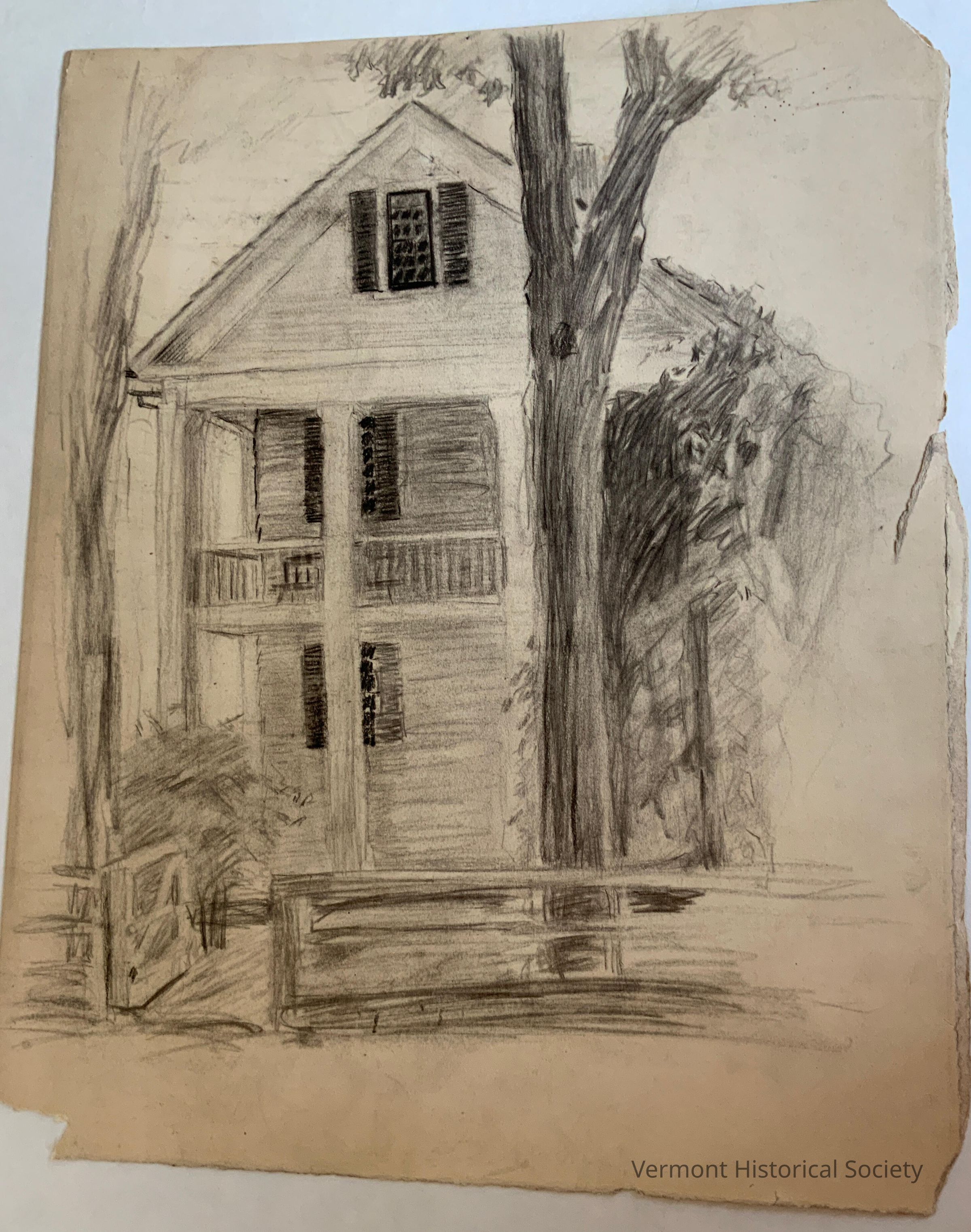 A graphite drawing of a federal style house with two story columns and a balcony. There is a large tree blocking the right side of the house and a fence surrounds everything. Unsigned and undated.