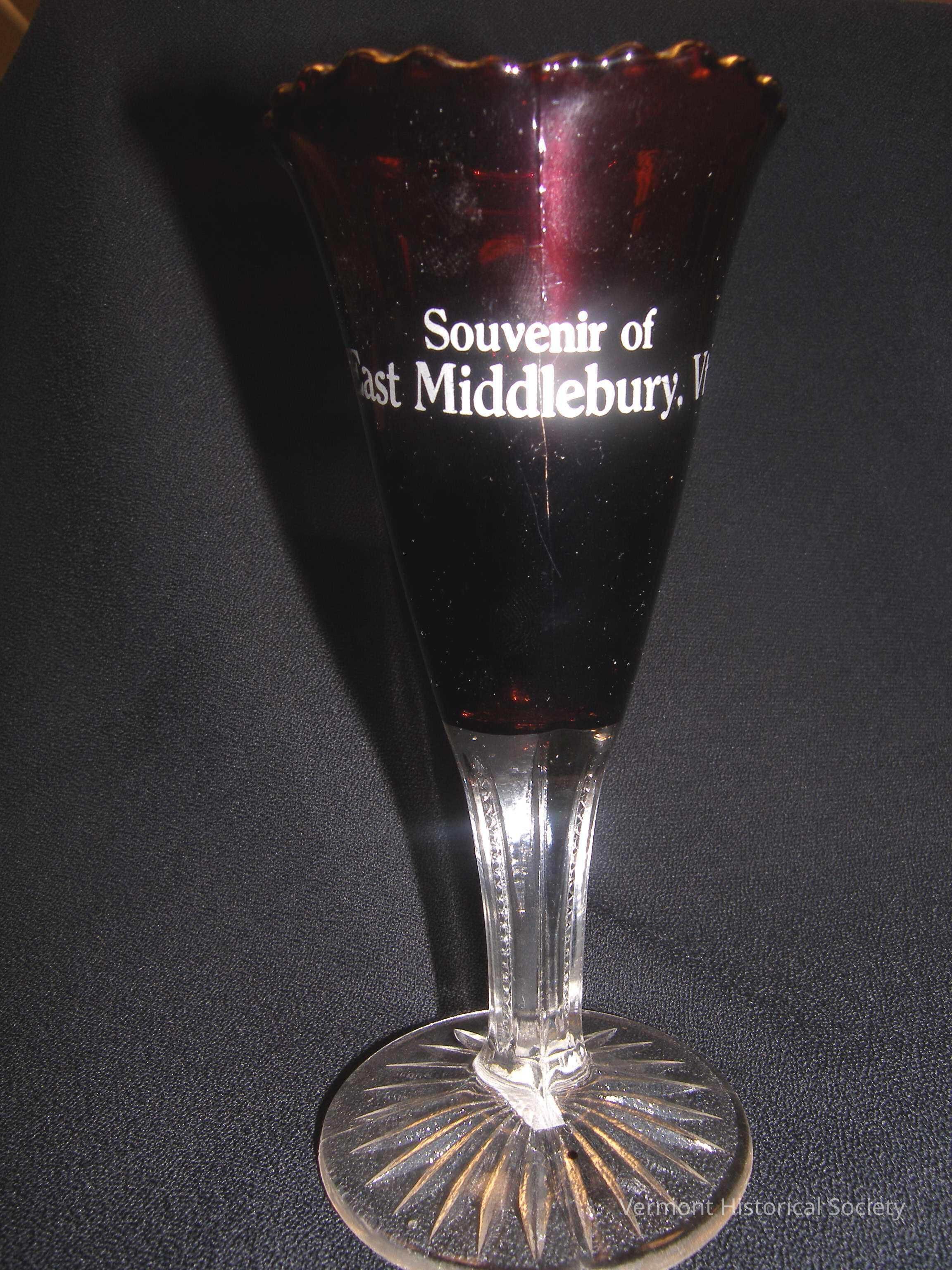 Molded glass stemmed drinking glass. The stem and base are clear glass and are molded into facets to imitate cut crystal. The bowl of the cup is red glass, and the top edge is wavy and gilded. The cup is printed with the white inscription, "Souvenir of East Middlebury, Vt."