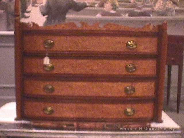 Bow-fronted dresser with birdseye maple drawer fronts. It has four drawers, each with two oval brass pulls. The corners are decorated with fluted wood columns. The top and bottom edges are decorated with scrolled carving.