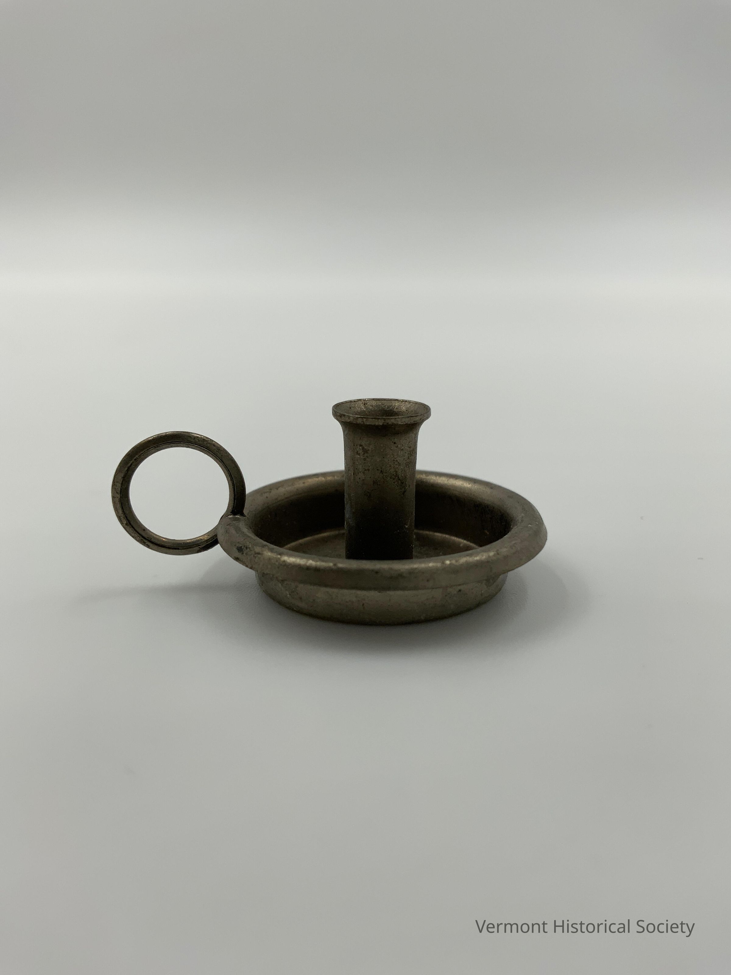 Miniature pressed tin chamber stick consisting of a round base, a central pedestal, and a round, wire handle.
