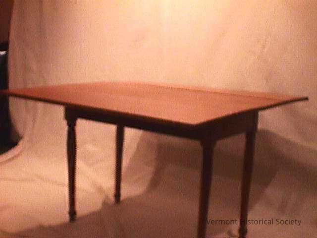 Drop leaf maple table. Underneath the table is the handwritten name, "Ezra C. Williams".