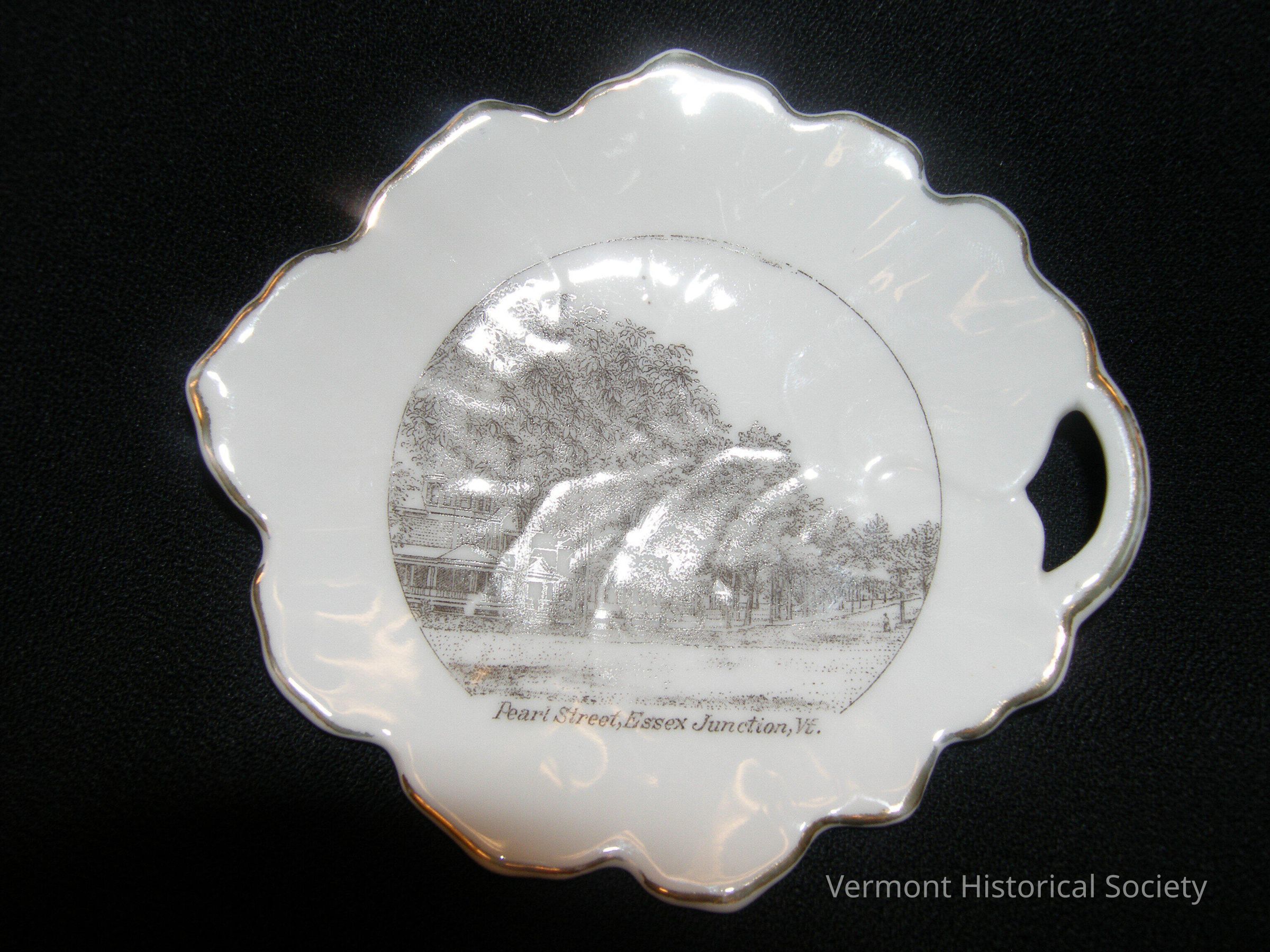 White porcelain leaf-shaped dish. The edges of the dish are gilded, and the center is printed with an engraved illustration of a tree-lined road with a large house on the corner. The image is labeled, "Pearl Street, Essex Junction, Vt." The bottom of the dish is marked, "P. C. C. Made in Germany for A. D. Douglas, Essex Junction, Vt."Context