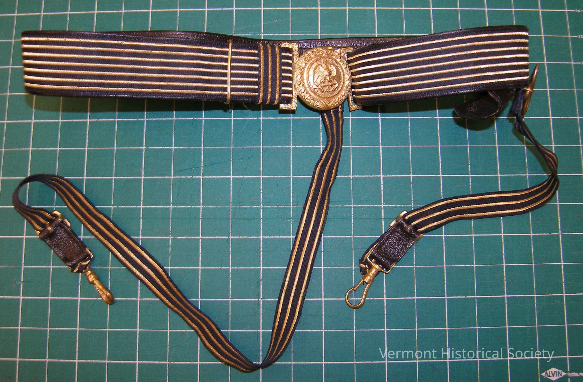 Black leather with a gold and black striped fabric on one side with a brass buckle and a brass hook hanging from belt, with matching straps hanging from each side of belt.