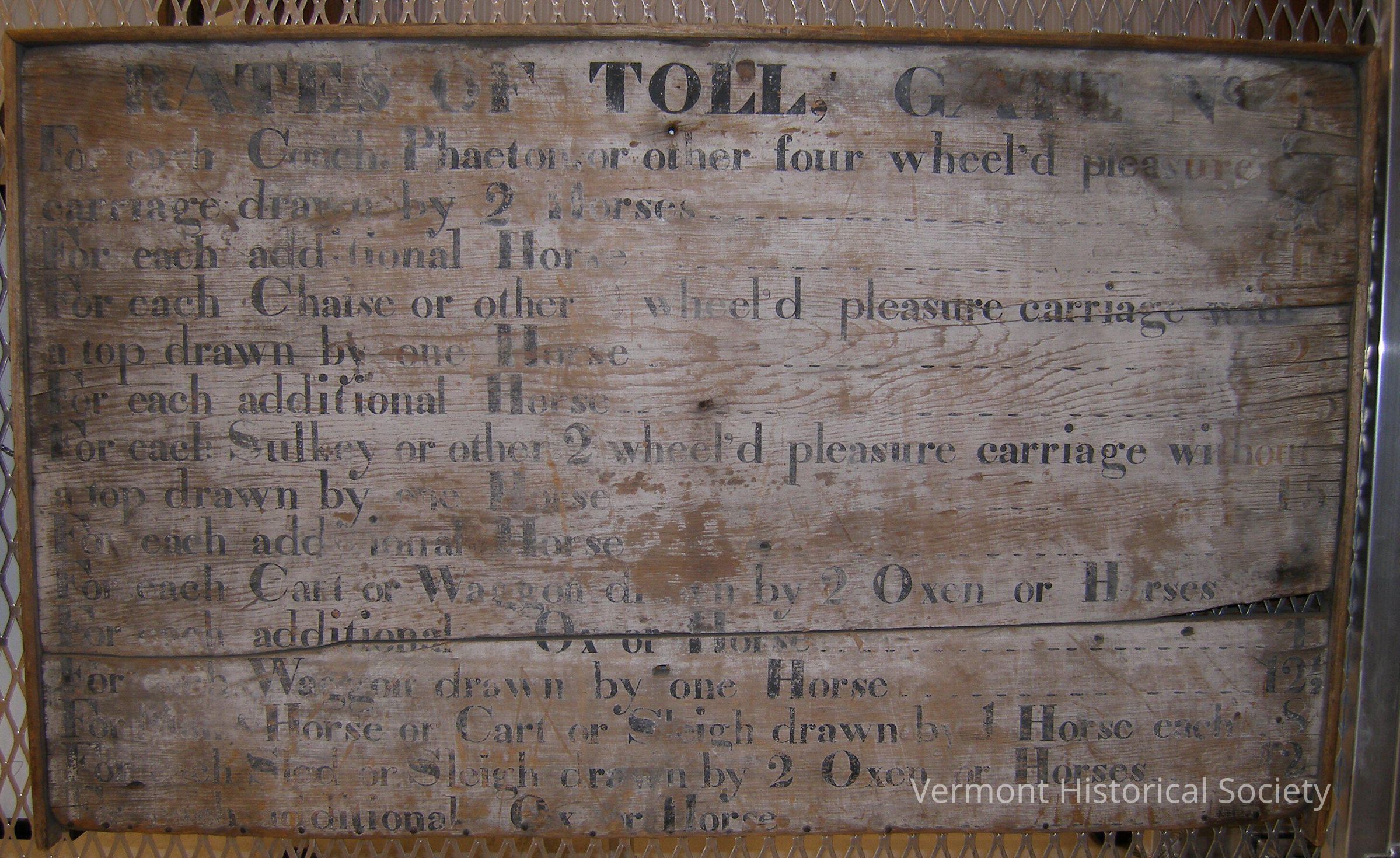 This sign is similar in age to the other toll road sign in this exhibit dating from the early 1800s. It was used at Toll Gate No. 4 in Stockbridge on the road between Middlebury and Woodstock. It may have hung on the old Cobb Bridge in Stockbridge which was near the donor's home.
