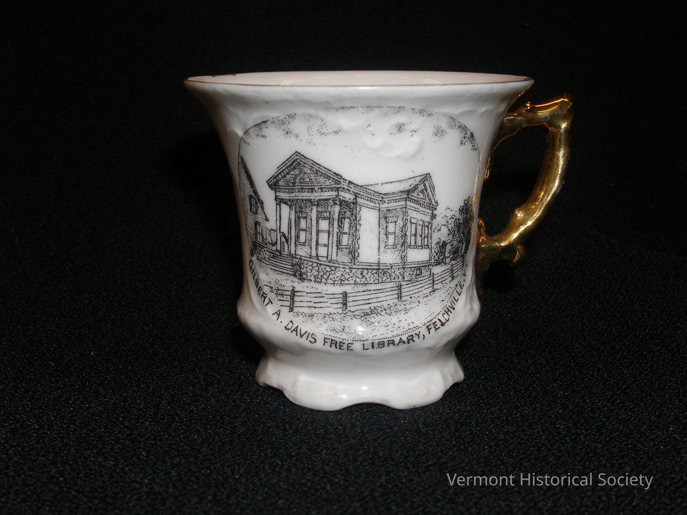 White porcelain footed demitasse cup with gilded handle. The cup is printed on one side with an illustration of a neoclassical building with four columns across a front portico. The image is labeled, "GILBERT A. DAVIS FREE LIBRARY, FELCHVILLE, VT." The bottom of the cup is marked, "Made in Austria Expressly for Watkins Bros. Felchville, Vt."
