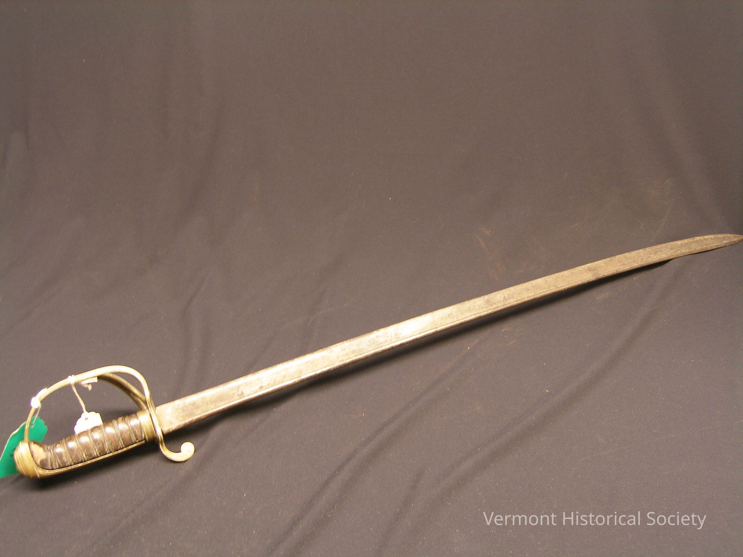 A Model 1833 dragoon sabre. The blade is very slightly curved, with the sharpened side curving up to meet the flat side in a point at the end. The handle is wrapped in leather and has a bronze guard. The letters "MS" are stamped on the guard.