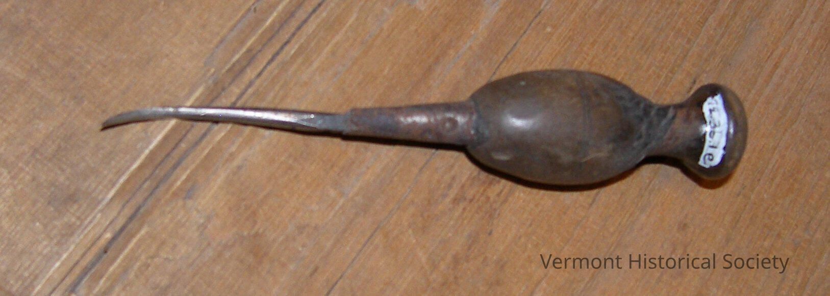 Awl with bulbous, turned wooden handle and curved metal spike.Context