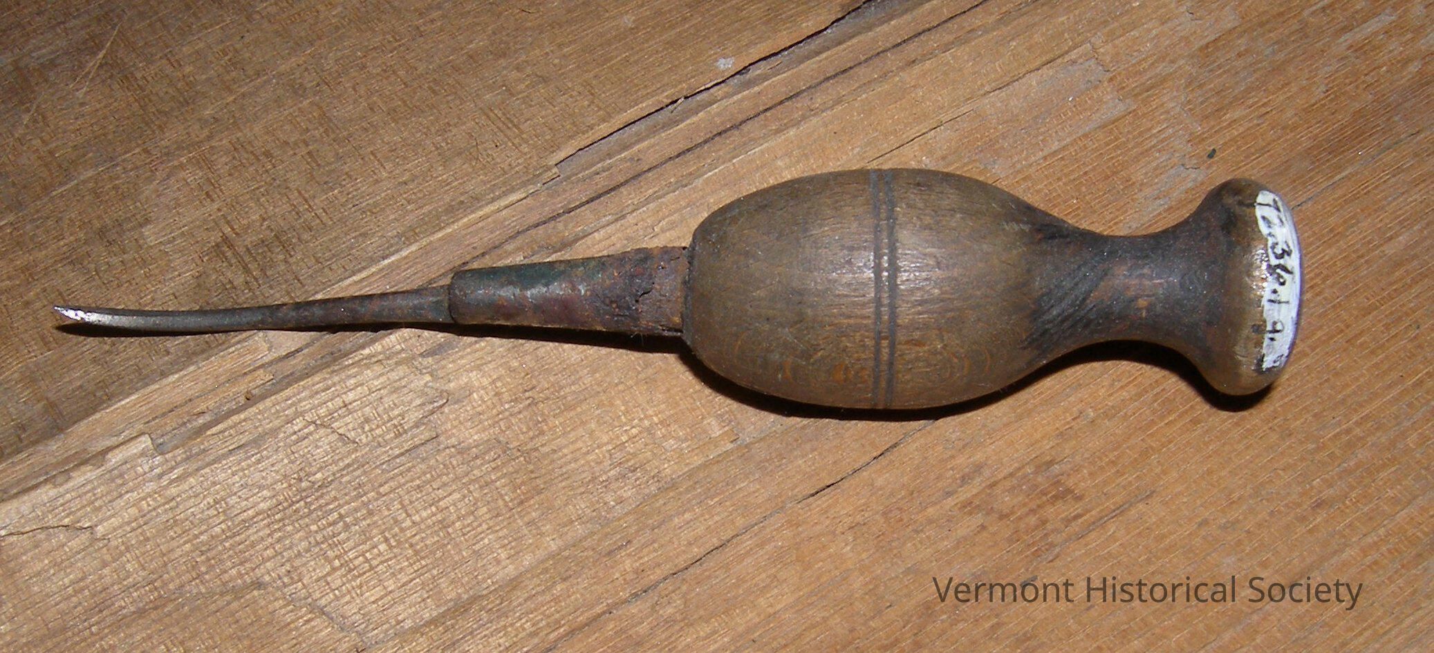 Awl with bulbous, turned wooden handle and curved metal spike.Context