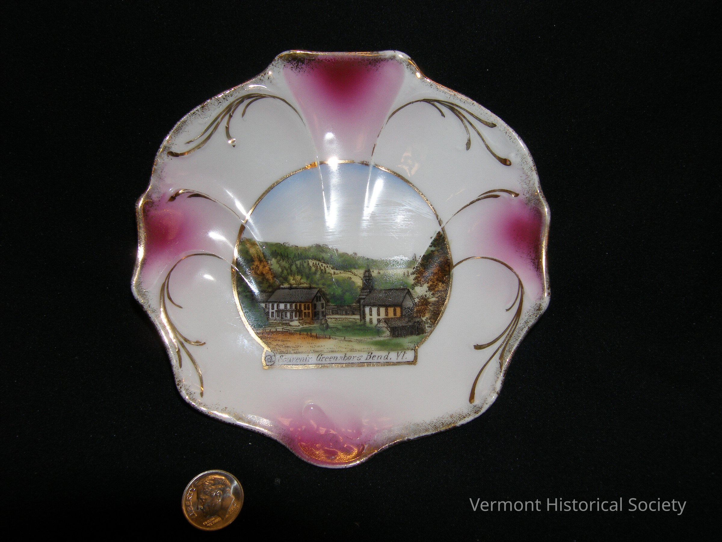 White porcelain shell-shaped dish. The dish is airbrushed pink in four places around the edge and accented with lines of gilding. The center is printed with a full-color illustration of a town or village with hills in the background. The image is labeled, "Souvenir, Greensboro Bend, Vt." The bottom of the dish is marked, "J. H. Pope, Greensboro Bend, Vt."Context