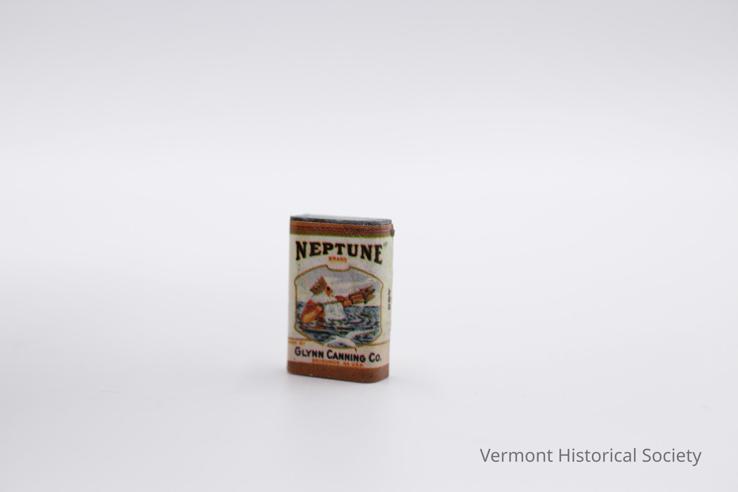 Miniature rectangular food-storage can. The can is made of silver-colored plastic wrapped with a paper label. One side of the label shows a bearded man holding a trident rising out of the water and the words, "NEPTUNE / GLYNN CANNING CO." The other side shows a large unshelled shrimp on a bed of lettuce with the words, "NEPTUNE BRAND SHRIMP".Context