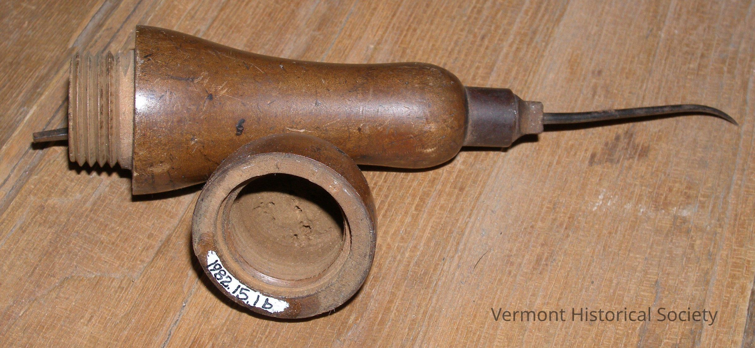 Harness maker's awl with a hollow, turned wood handle. The end of the handle unscrews and holds five interchangeable tips, one of which is a screwdriver.Context