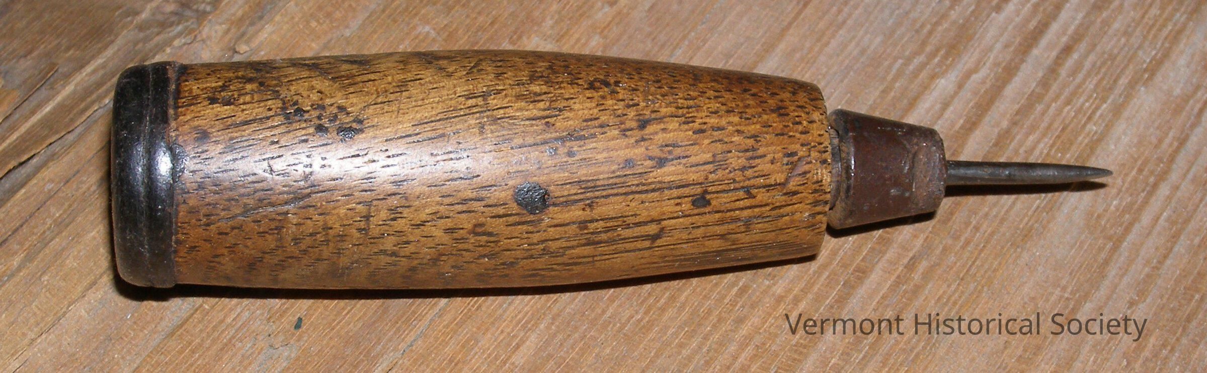 Short-spiked awl with turned own handle. The end of the handle is reinforced with a metal ring.