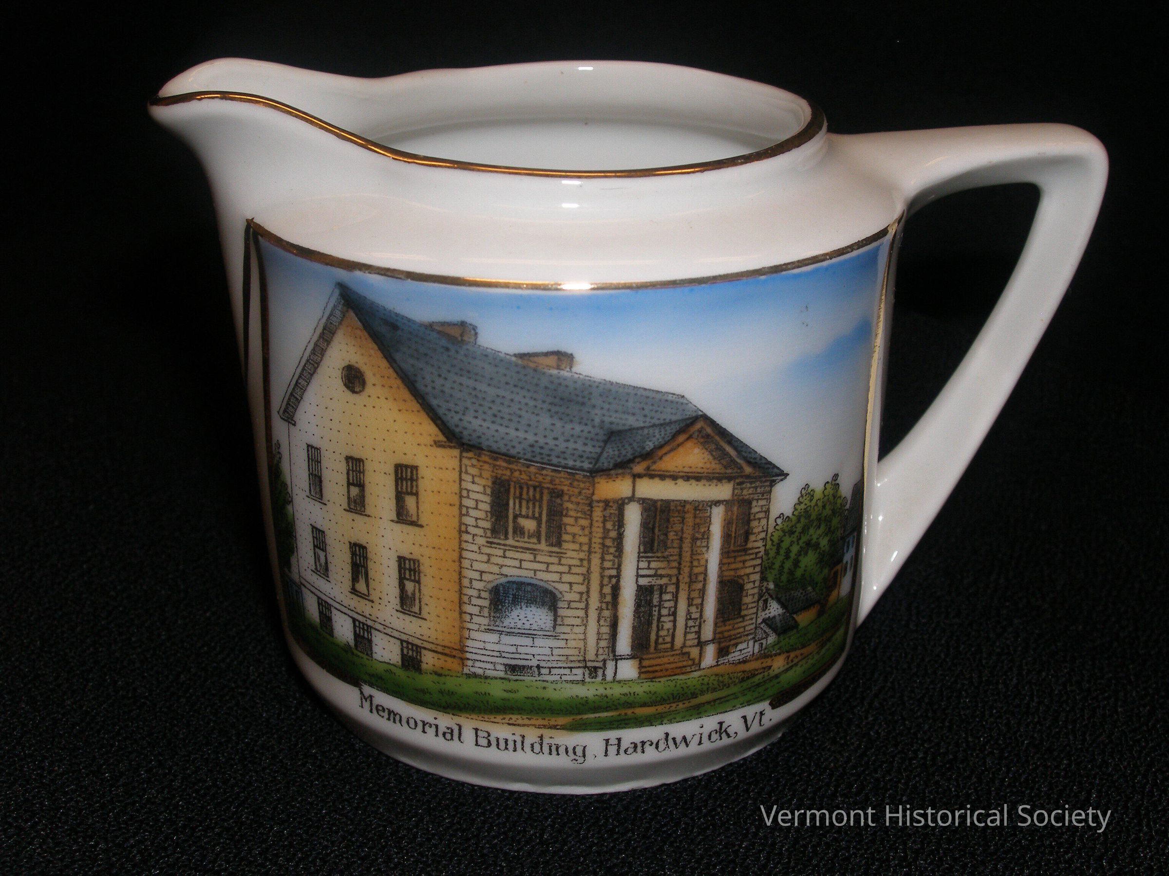 White porcelain cream pitcher with a full-color illustration of a brick building with two columns supporting a narrow portico at the entrance. The building is shaded yellow with a grey or blue roof. The image is labeled, "Memorial Building, Hardwick, Vt." The bottom of the pitcher is marked, "MADE IN GERMANY FOR THOMAS & THOMAS HARDWICK, VERMONT.