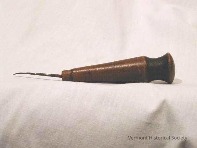 Harness maker's awl with a turned wooden handle. The handle flares outward to the end and is molded with indent, creating a knob on the end. The tip is set almost perpendicularly into the handle, and the end is curved.