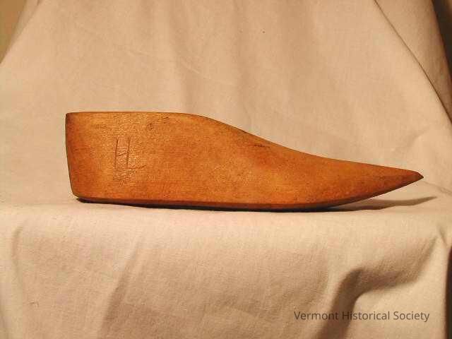 Straight-soled shoe last with a pointed toe. One side is carved with the letter H.