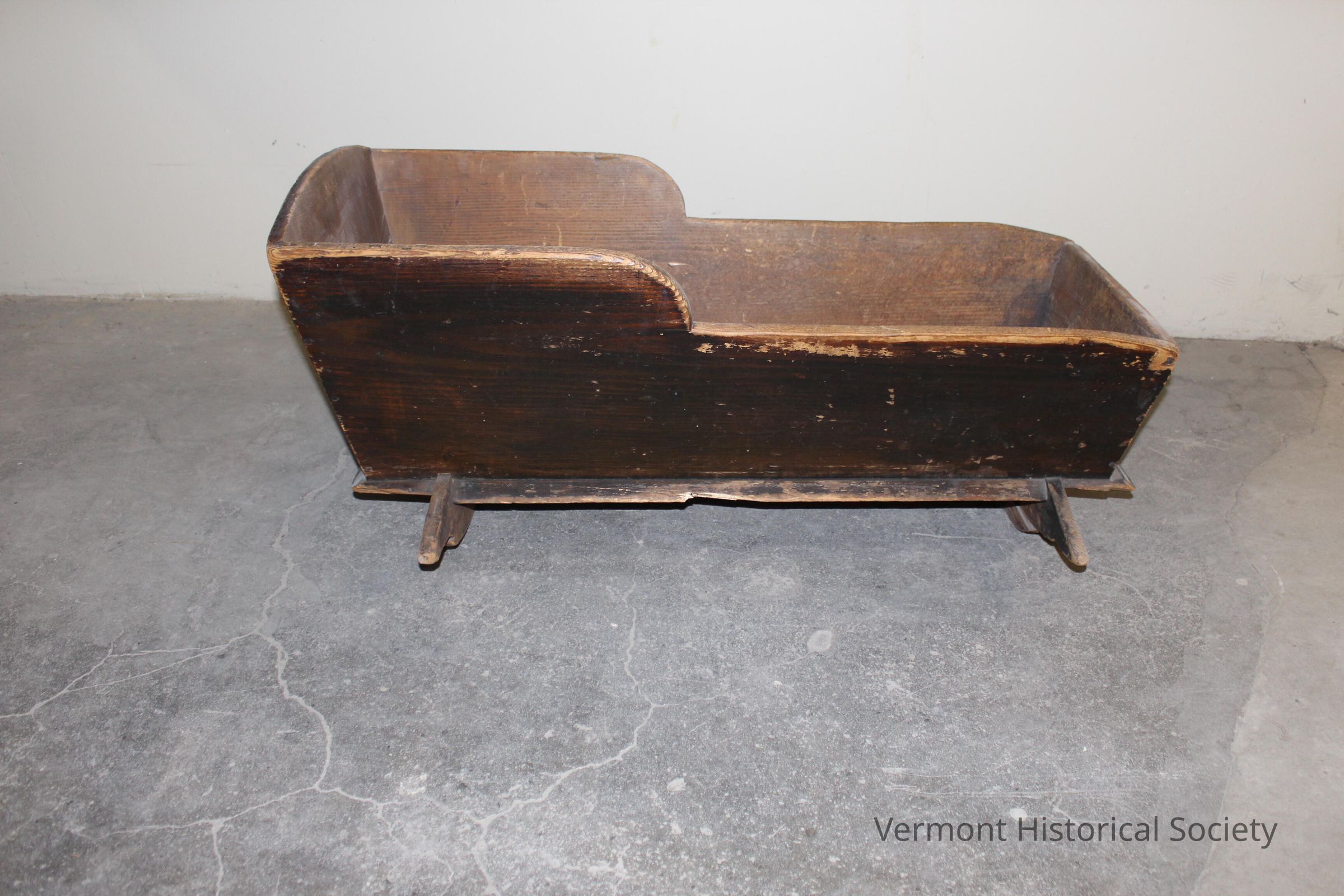 Wooden rocking cradle sized for use by a baby. It has straight, flared sides that are higher at the head. It sits perpendicular on two rockers allowing it to rock side to side. It is unpainted.