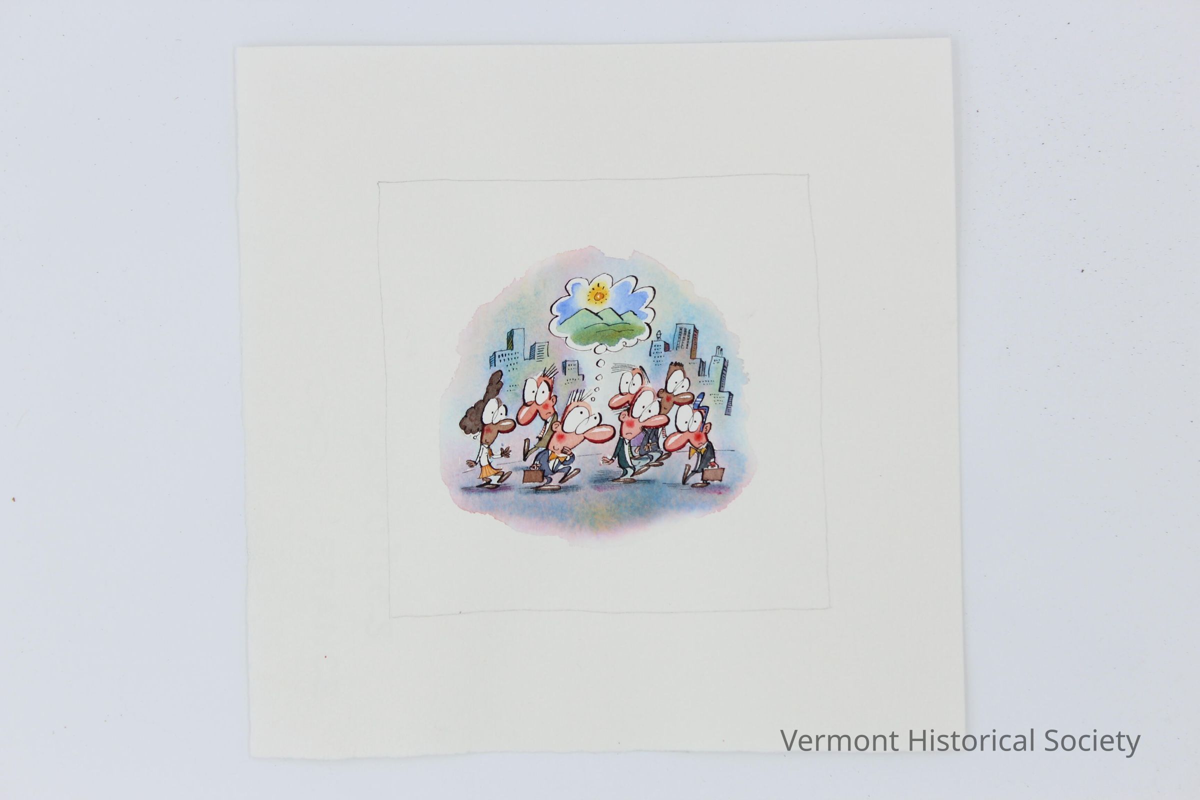 Original watercolor illustration showing showing several people in business attire walking through a grey city. One man in the center of the image is smiling with a thought bubble above his head showing an image of green mountains, blue sky, and the sun.Acquisition