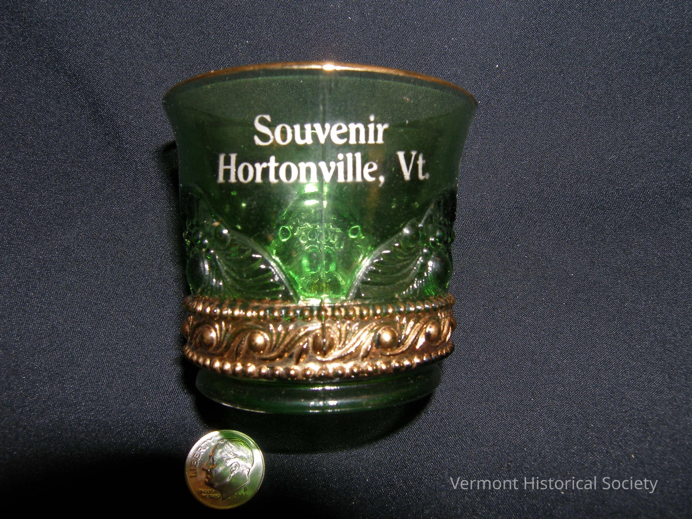 Green molded glass toothpick holder. The cup is molded with leaves and scrolls around the middle, and a band of scrolled molding is gilded. The top edge is also gilded. One side is printed with the inscription, "Souvenir Hortonville, Vt."Context