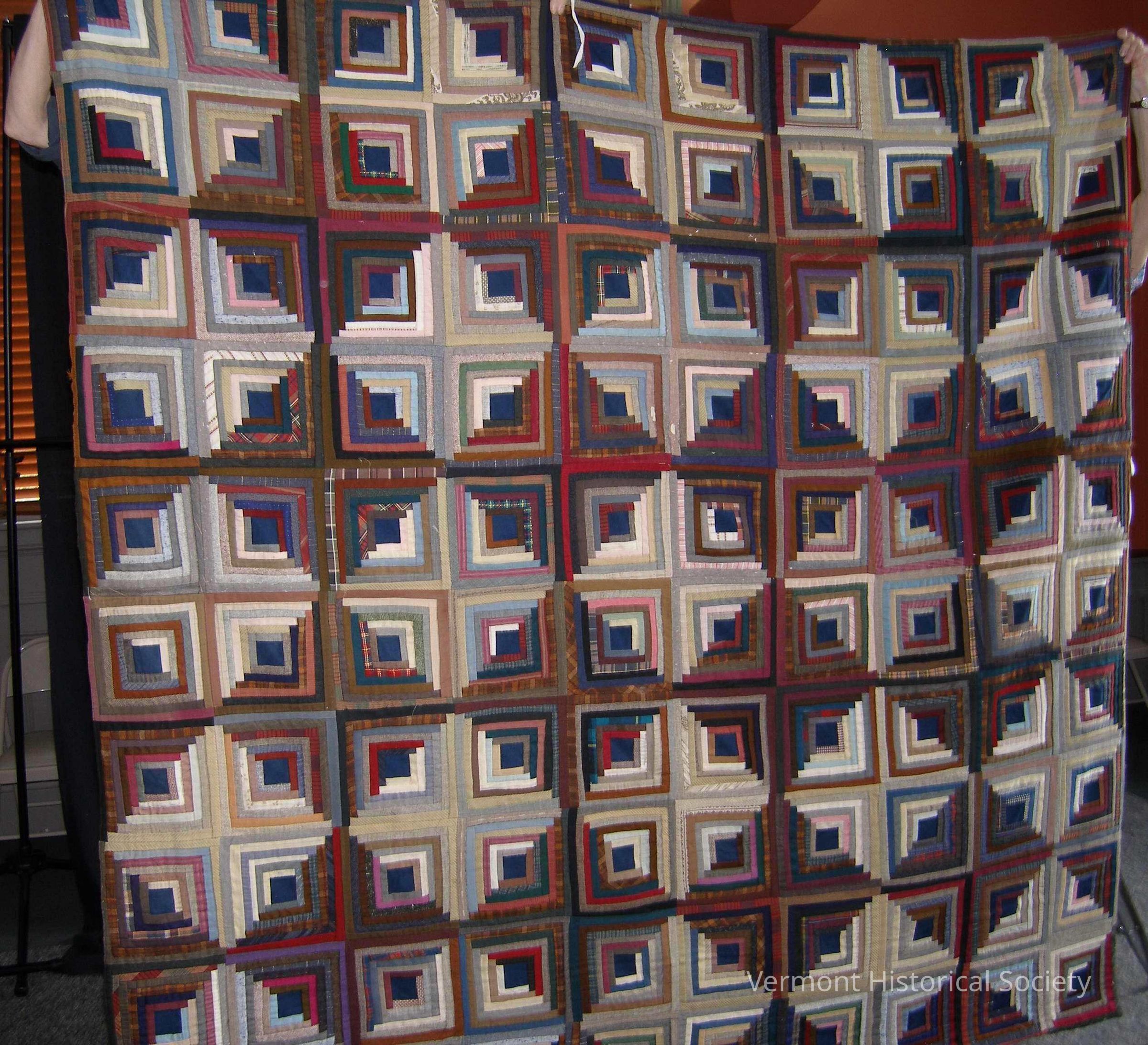 Pieced quilt in a variation of a log cabin pattern. Each block is pieced around a dark blue center, with half the block formed of dark/deep colored fabrics and the other half formed of light-colored fabric, creating an alternate visual pattern of light and dark diamond blocks. The fabrics are all wool, and are both solids and patterned. The back is pieced in a plain, nondecorative block pattern. However, the colors are carefully arranged to create a bull's-eye effect.Context