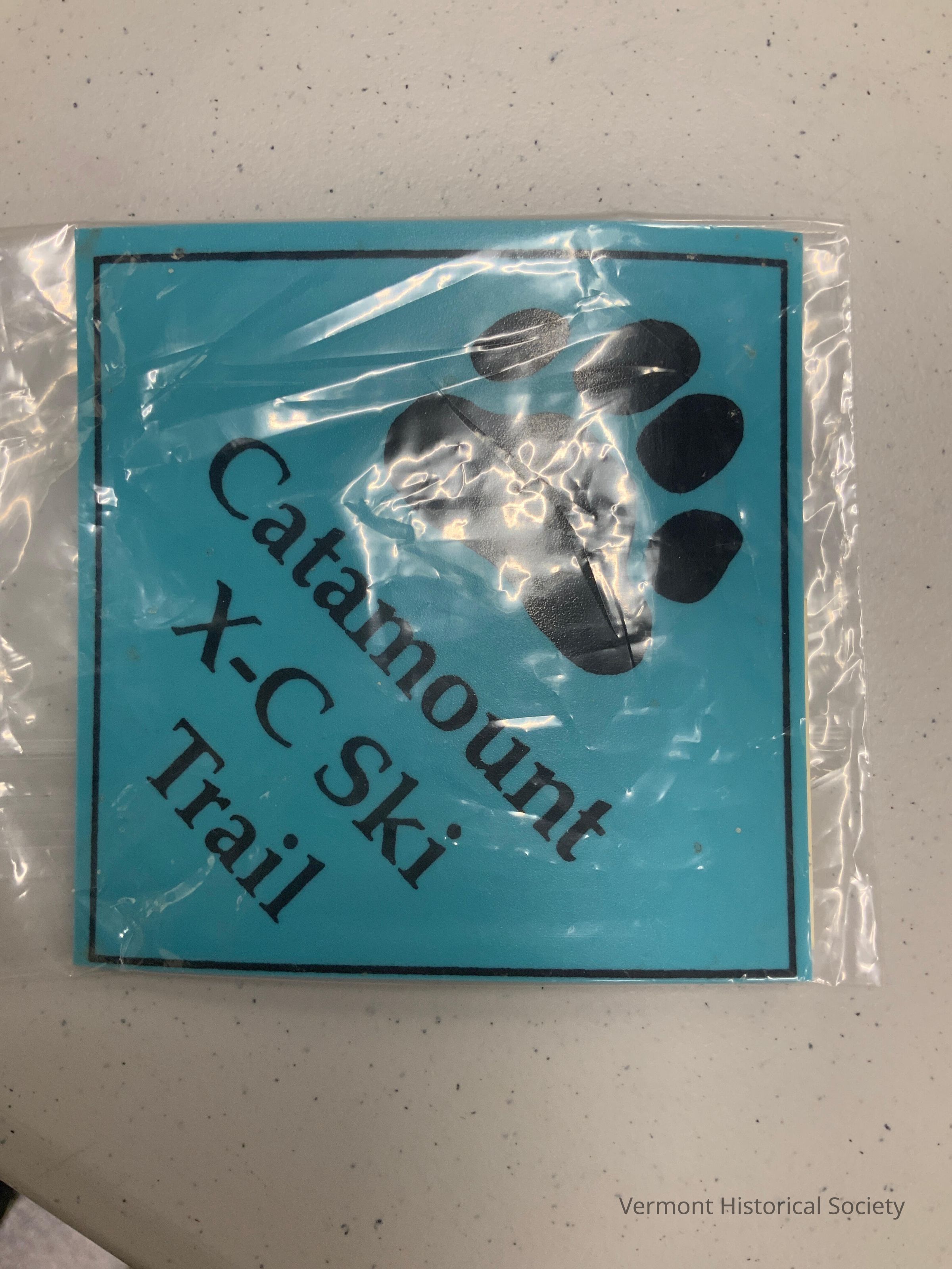 Square plastic trail marker printed in black with an image of a paw print and the words, "Catamount X-C Ski Trail".