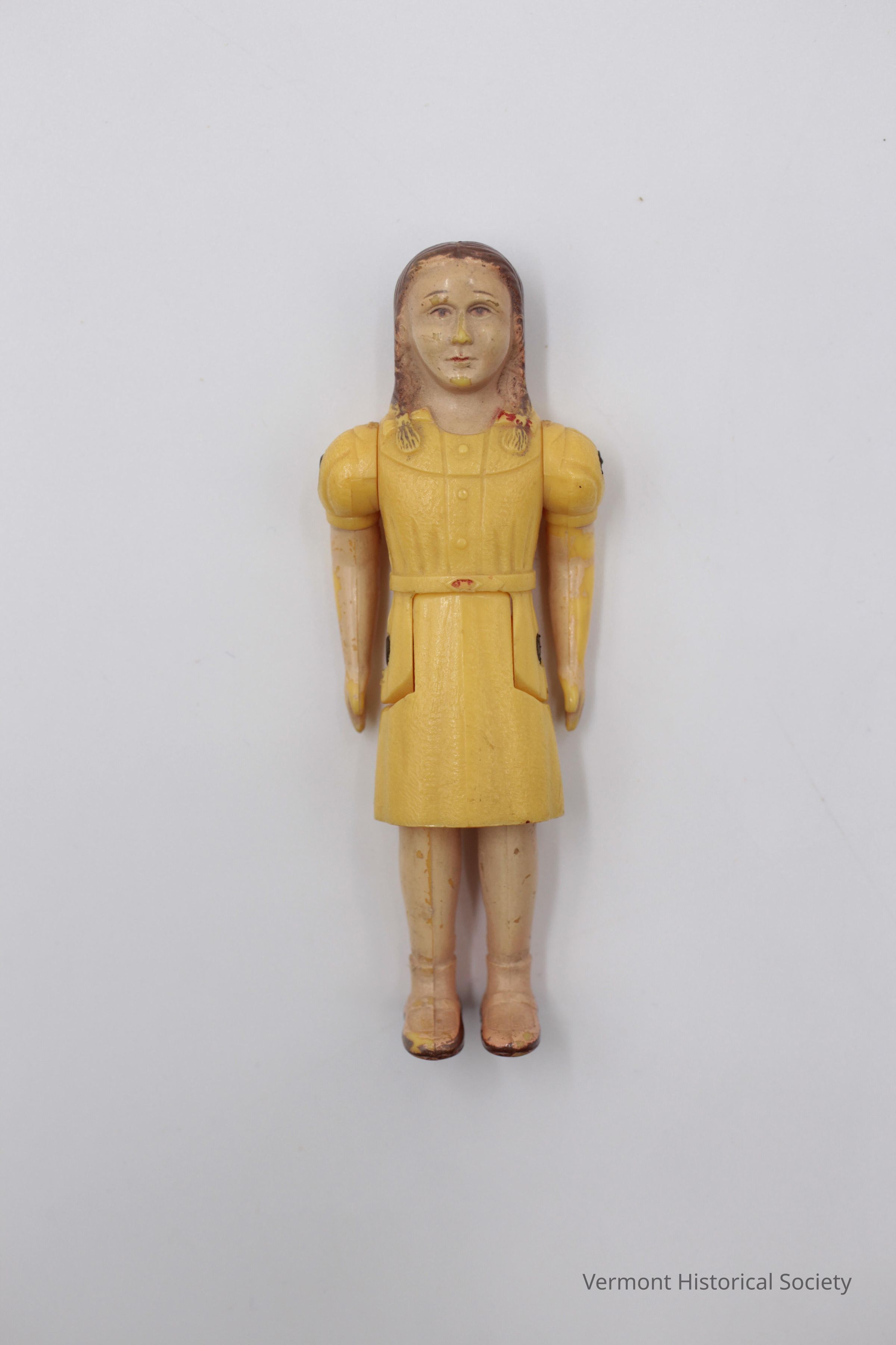 Small doll sized for use in a dollhouse. The doll has cream-colored skin and molded, long brown hair held in two braids. It is wearing a yellow dress with a white neckline and brown shoes; the clothes are molded. The doll hinges at the waist, shoulders, hips, and knees.Context