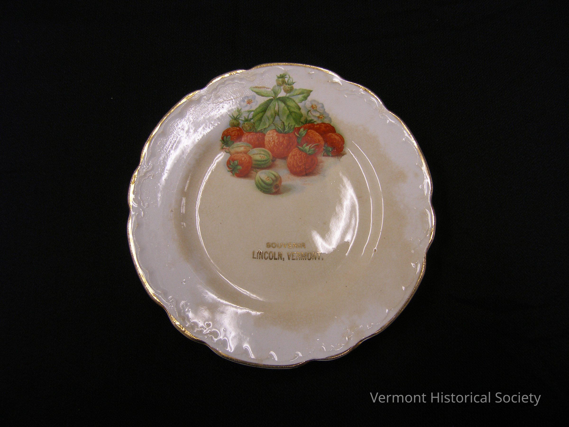 White ceramic saucer with gilded and scalloped edge. The top rim of the plate is printed with a full-color image of strawberries, strawberry blossoms, and a lobed, green fruit. Just below center is the printed inscription, "SOUVENIR LINCOLN, VERMONT" in gold. The ceramic body is stained from use.Context
