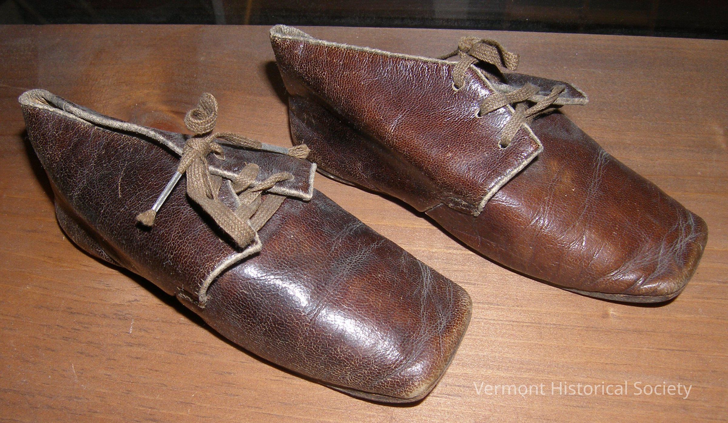 Brown leather children's shoes. The uppers are constructed in two parts: the two and the back. They have a square toe, and the back reach up over a short tongue and secures with laces.Context