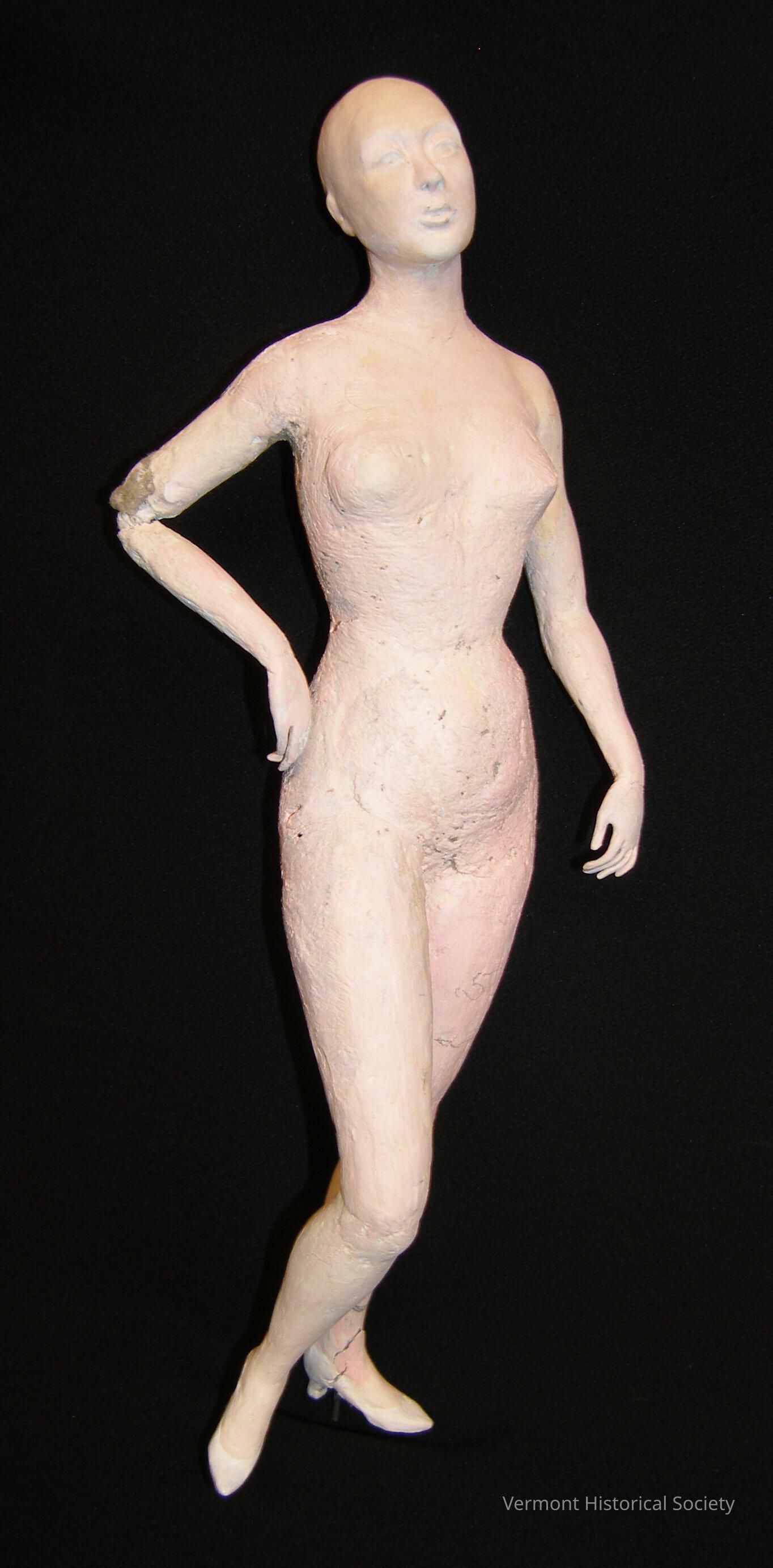Human figure made of papier- mâché over a wire frame. The figure is of a nude woman with one arm down and the other on her hip. White, heeled mary-jane shoes are molded with her feet. The body is painted pink and the shoes are painted white.Context