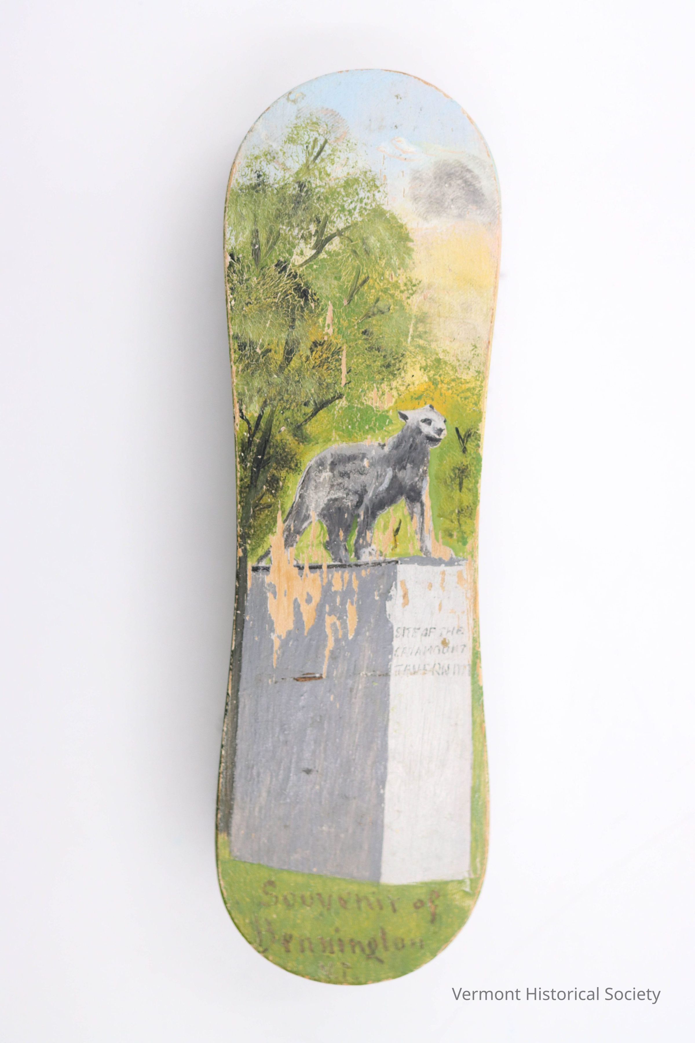 Shoe polishing brush with a painted handle. The brush has horsehair bristles stemming from the entirety of one side of the handle. The other side of the handle is painted with the image of a monument of a mountain lion (the catamount monument in Bennington, Vermont) set in an exterior scene. The bottom is labeled, "Souvenir of Bennington".