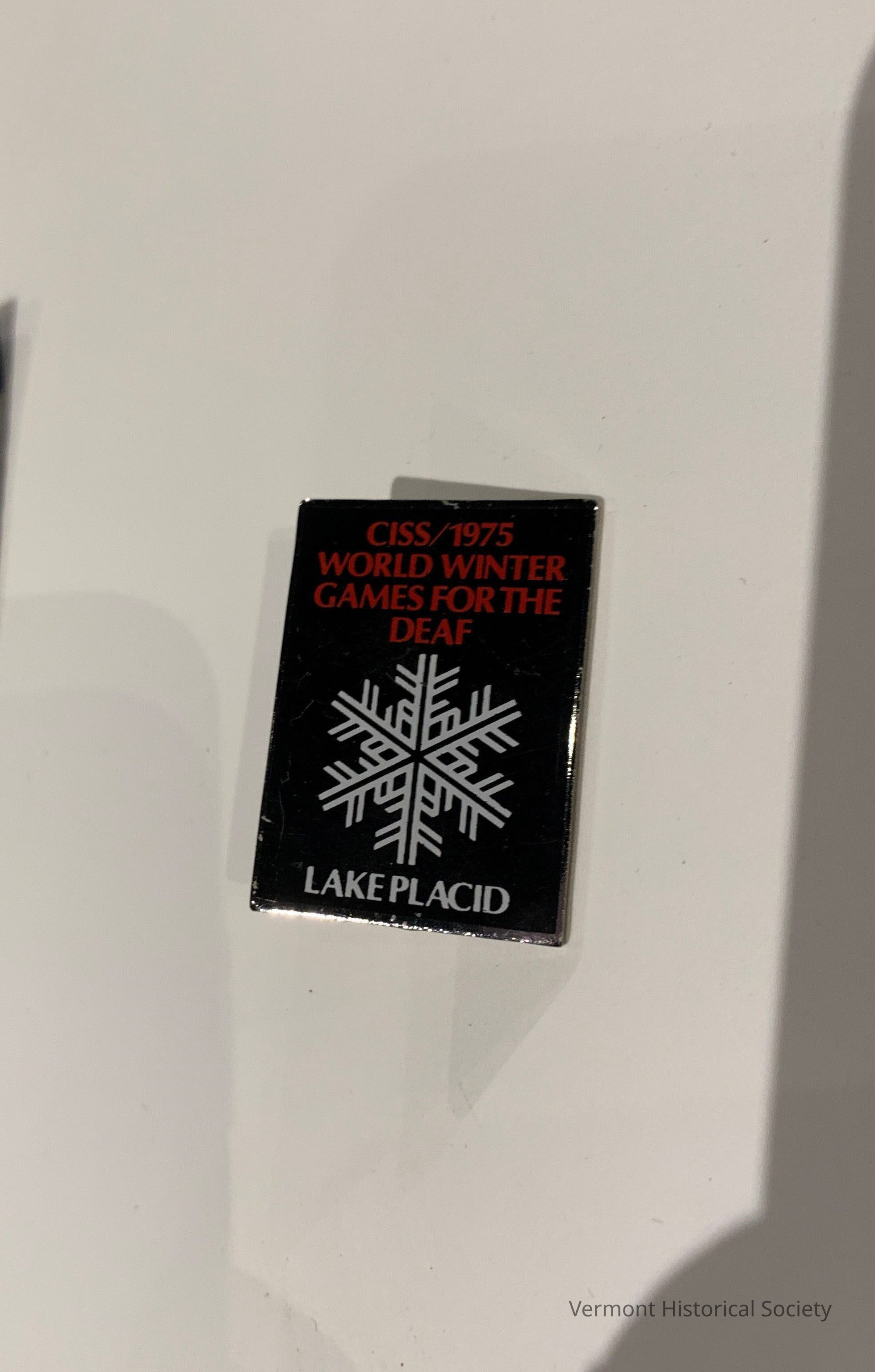 Commemorative pin. The rectangular pin has a black enamel ground with two straight silver fastenings on the back. The front is inscribed "CISS/1975 / WORLD WINTER / GAMES FOR THE / DEAF" in red with a white snowflake in the center and "LAKE PLACID" in white at the bottom.Context