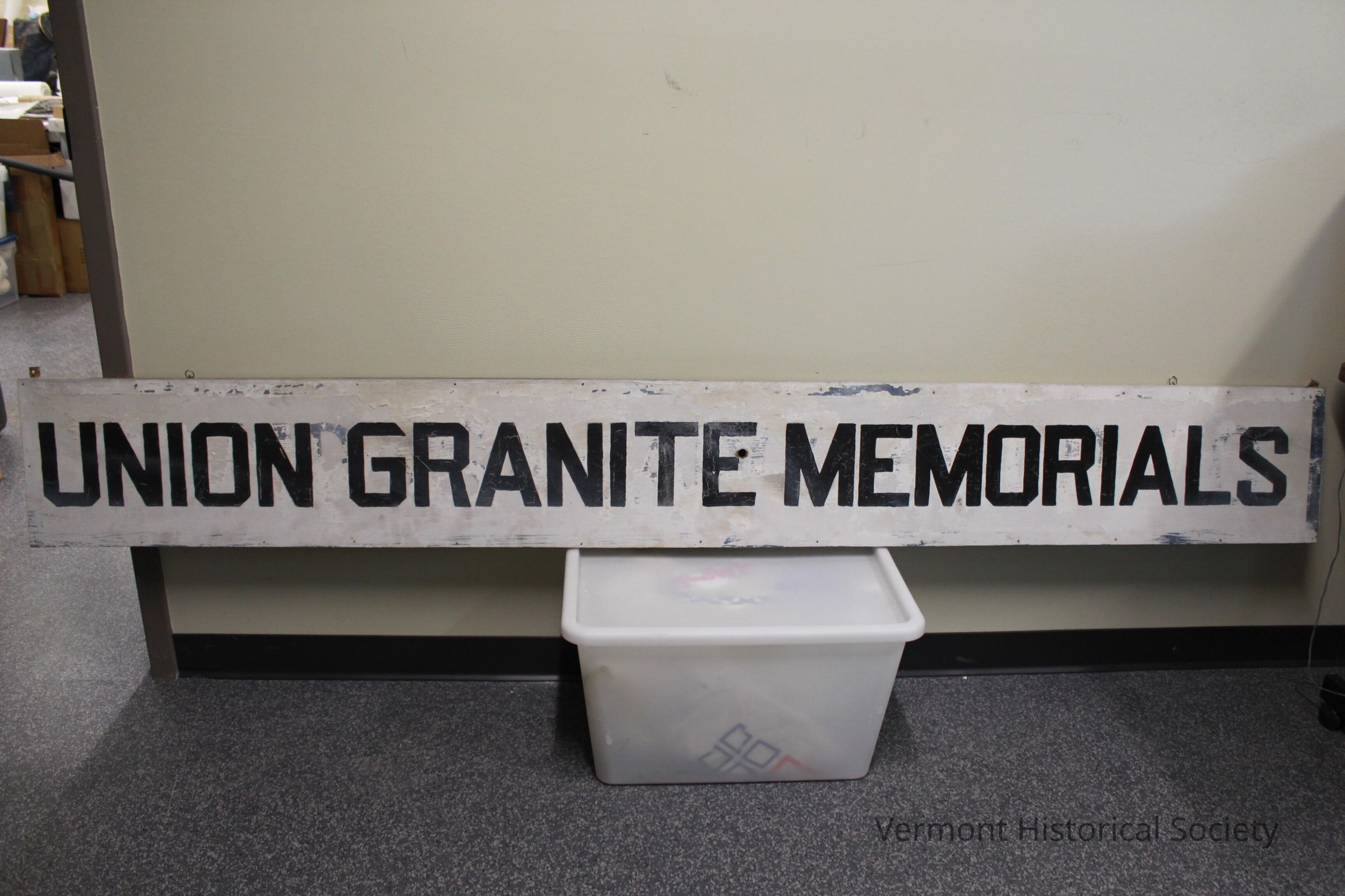 Large sign with "UNION GRANITE MEMORIALS" in block print. Constructed of one large piece of masonite on front, nailed to wooden framing on back. Wooden framing made up of 1 3/4"w x 3/16"d by various length pieces. Background is painted white, lettering in black painted block letters. At back on top left and top right, rusted metal pieces screwed to framing for hanging hardware. Due to wear pattern on back of wood, there appear to have been 5 more of these at one time, at the midway point top and bottom and on the bottom left and right corners. Two modern hangers attached to back. Painted over another sign, (white background, blue border with blue letters) showing through peeling paint.Acquisition