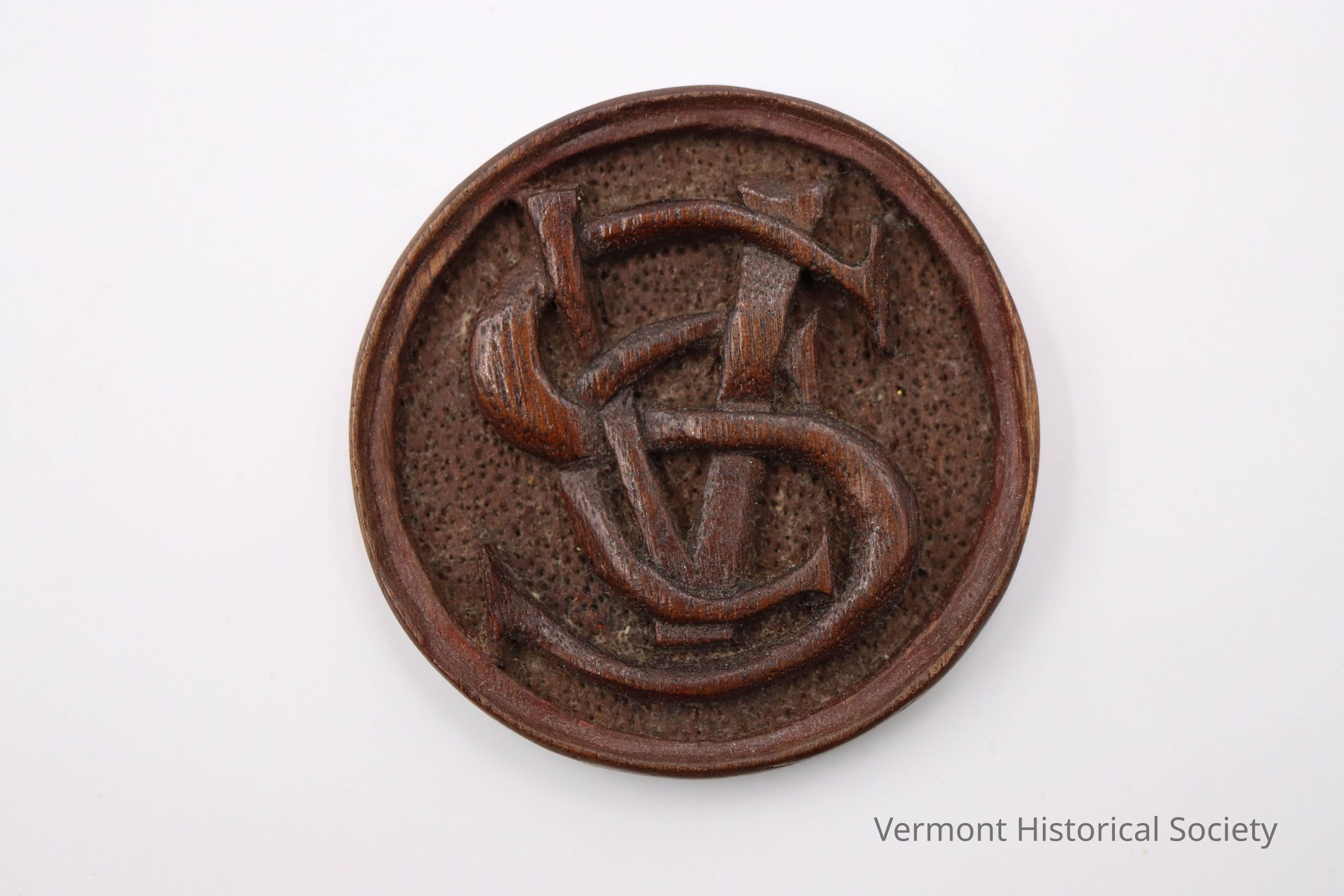 Round, carved wooden medallion with the entwined initials "SVC". The ground is pierced with small divots, giving it a mottled appearance.Context