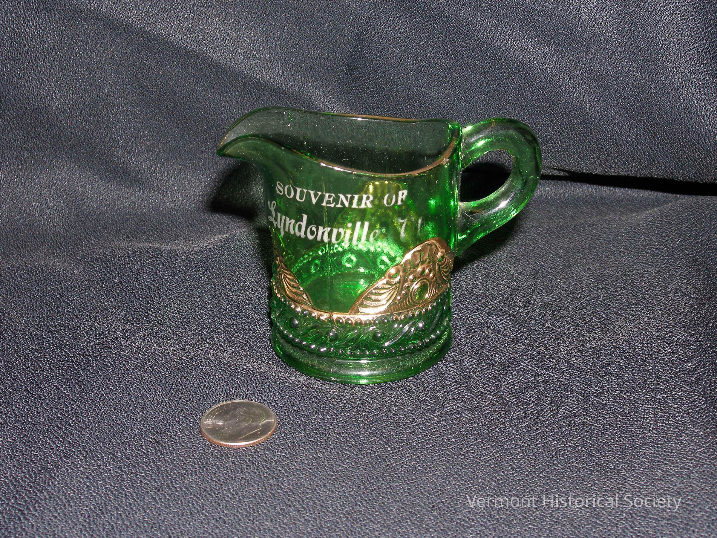 Green molded glass cream pitcher. The pitcher has a small handle and straight sides. The bottom portion is molded with scrollwork and a portion of the molded design is gilded. One side of the pitcher is printed with the white inscription, "SOUVENIR OF Lyndonville, Vt."